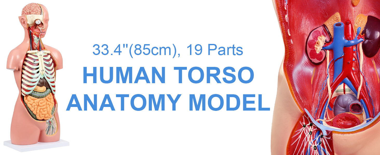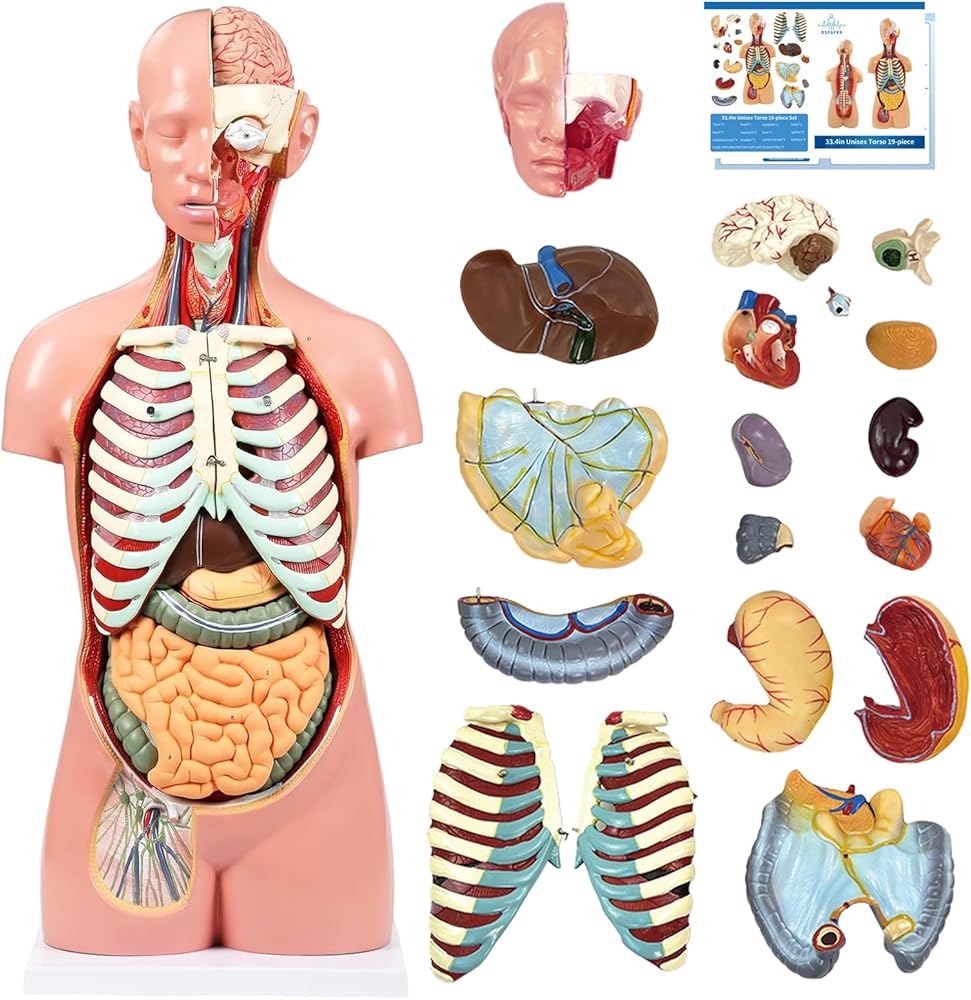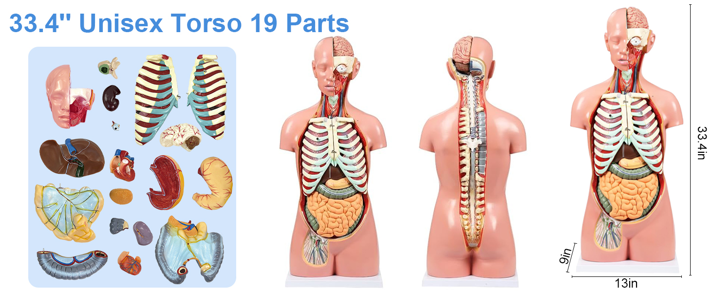 Unisex Torso Model - This 33.4" Tall Life-Size Torso Model features 19 removable parts, allowing an in-depth view of the human body, including the head, lungs and rib cage, heart, liver, stomach, lungs, kidney, spleen, intestine, bladder, and 8th thoracic vertebra