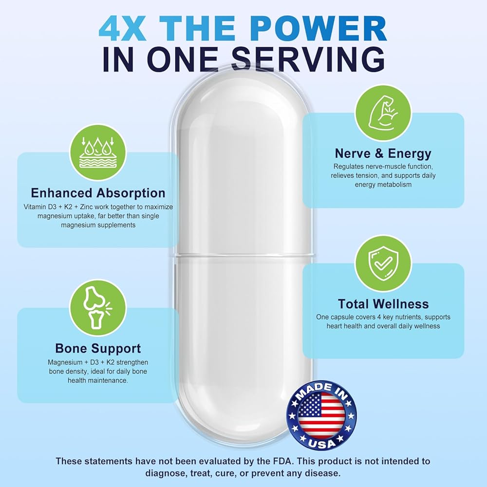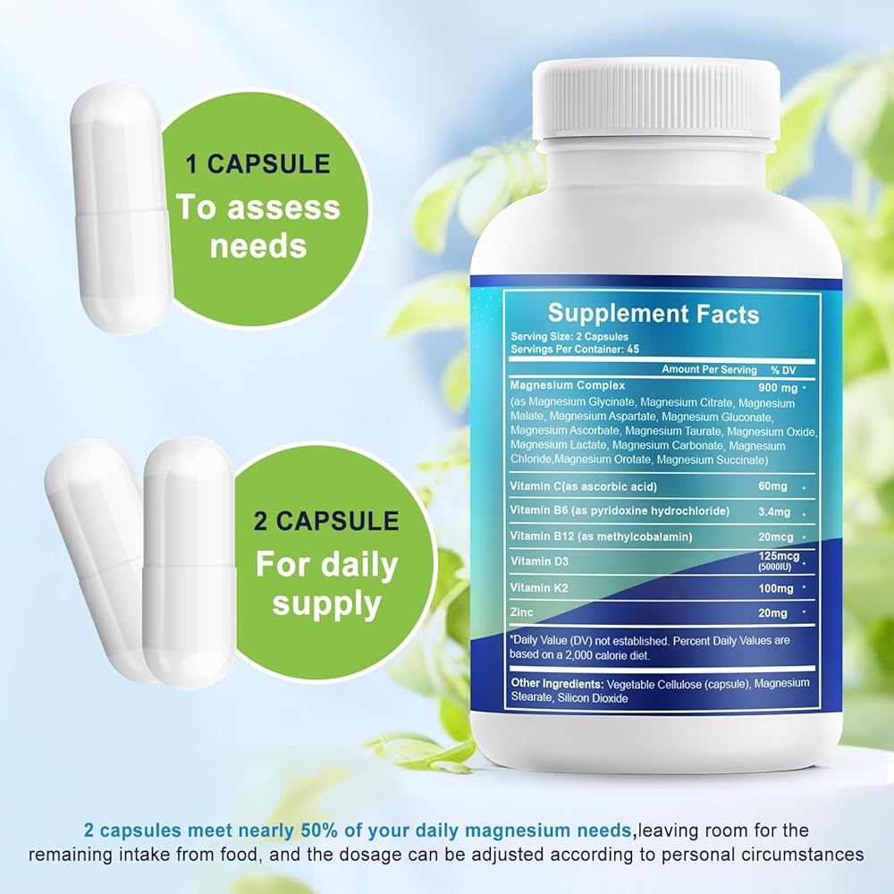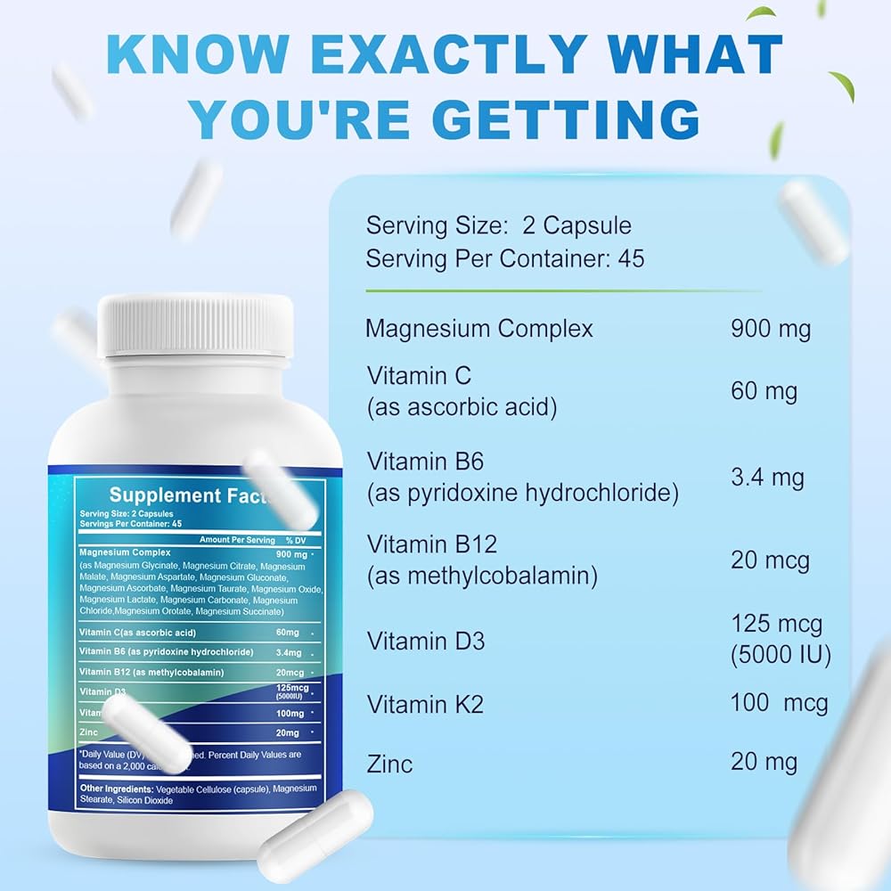 • مركب المغنيسيوم عالي الامتصاص مع العوامل المساعدة الرئيسية: يتكون من فيتامين د3 وفيتامين ك2 والزنك وفيتامين ب لدعم استخدام المغنيسيوم والتوازن العام للمغذيات للمكملات اليومية.