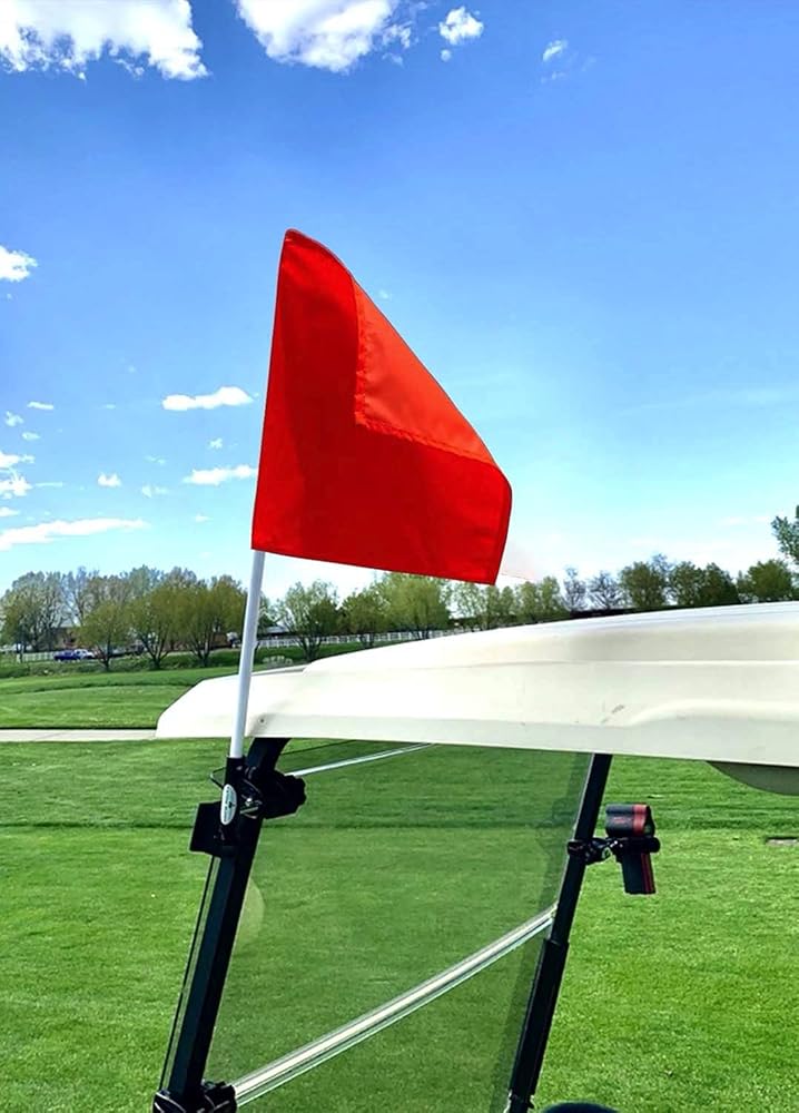 Are you looking for an Orange Safety Flag to mount onto your golf cart? This flag is made with all UV Safe material and if perfect for your golf cart. We sell it with a washer to lock in the mount so you can drive up to 40mph without it falling down. The flag stick is 20" Long and the clamp will mount on front or the back roof support on your golf cart! This flag is perfect for all the new state laws that require the orange safety flag on your golf cart!