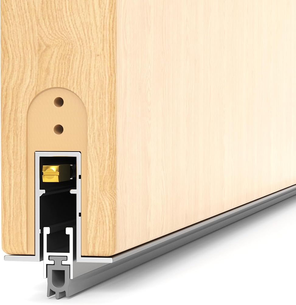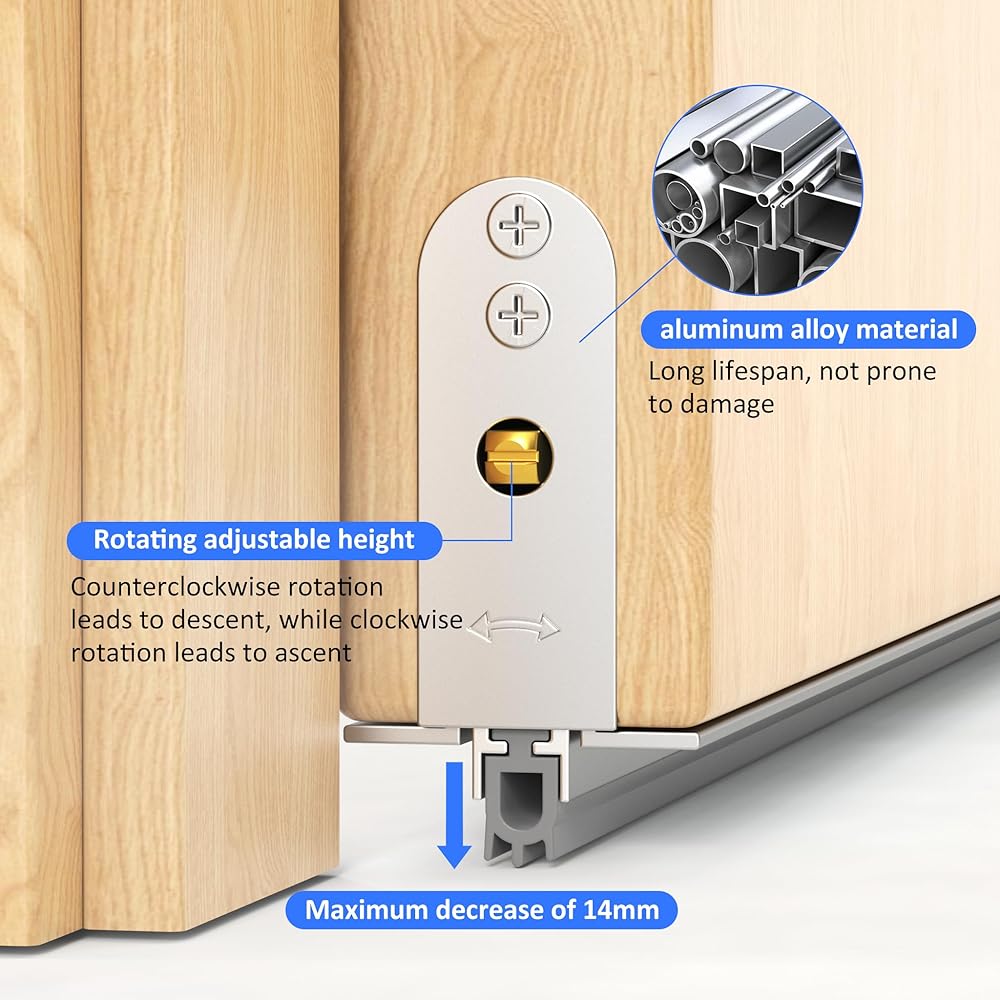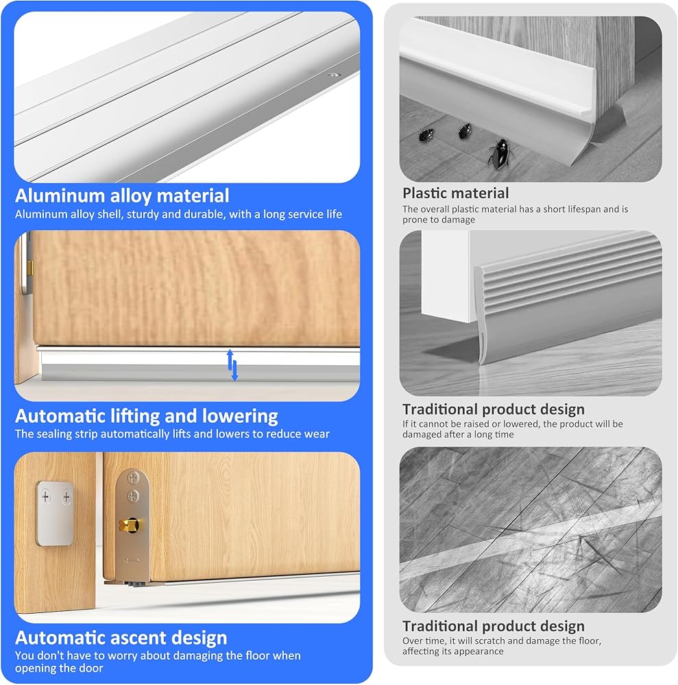 Wonderful design:Hidden automatic lifting designto effectively reduce noise,Most Up to 0.59in downward,prevent dust from entering through the door, the door stoppers for bottom of door keeps the room quiet and neat. Self-adhesive door draft blocker is very suitable to cover the gaps of exterior/interior doors, rv doors, shower room, baseboard, threshold, windows, garage, basement and furniture
