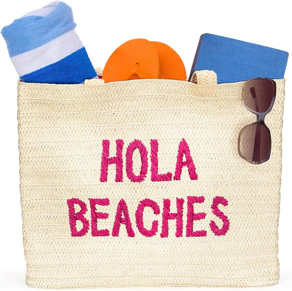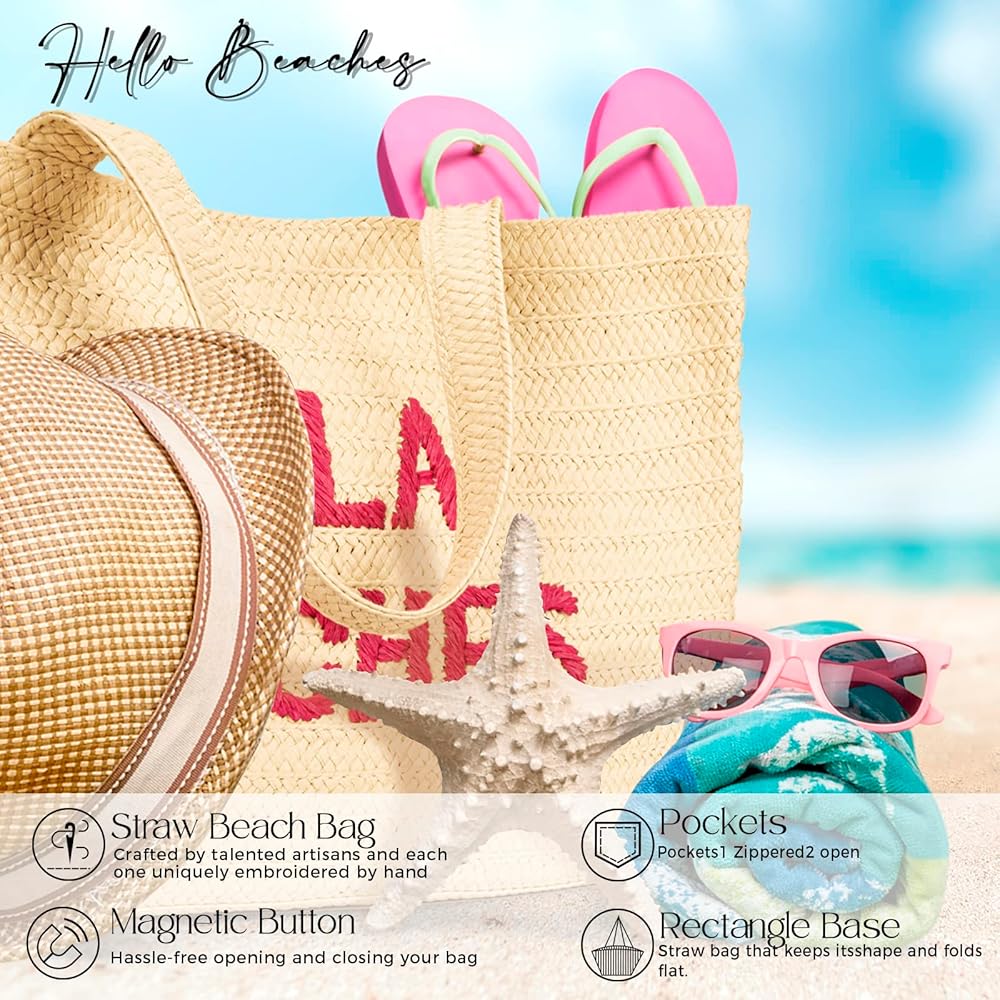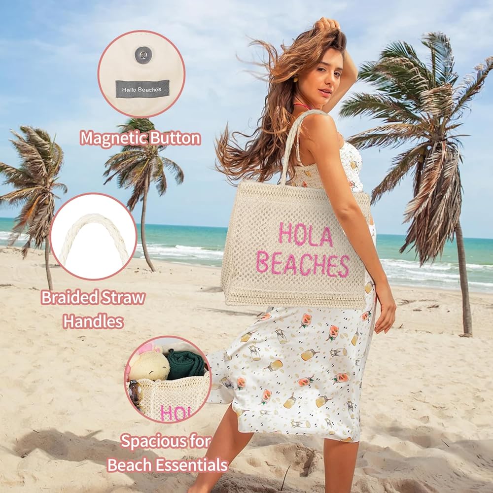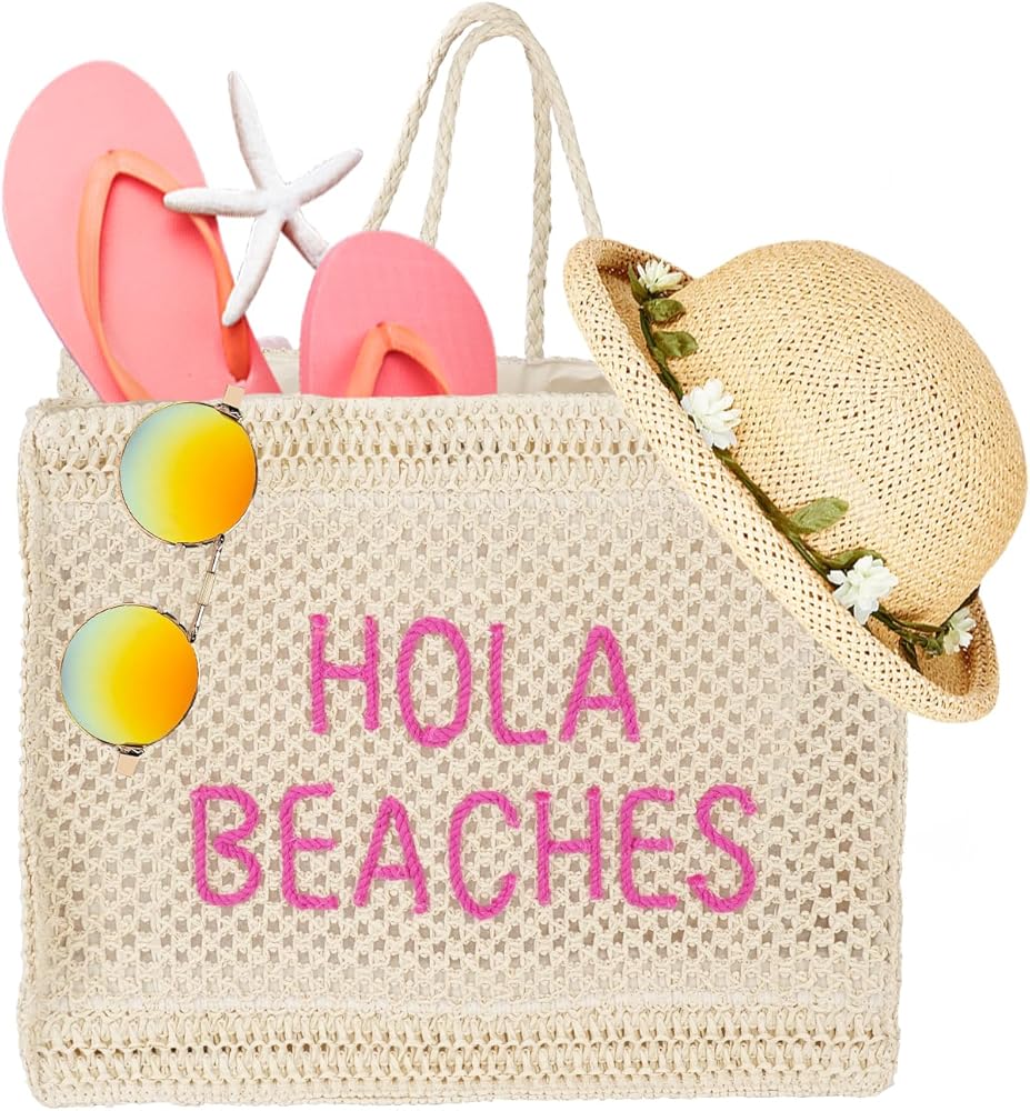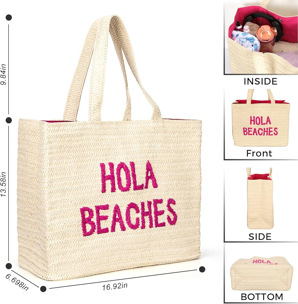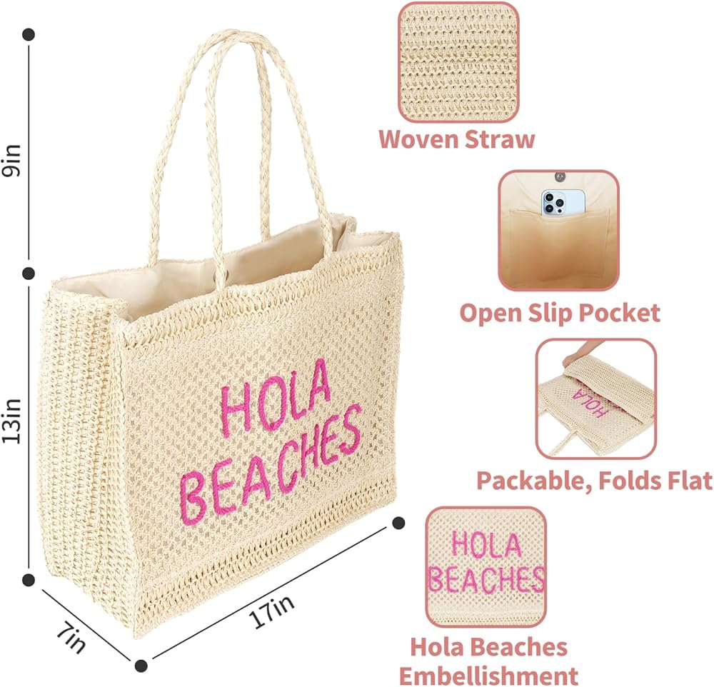 Introducing the ultimate beach tote bag collection! Our Hola Beaches straw beach bag is a must-have for every beachgoer. Hand-embroidered by skilled artisans, each tote is uniquely crafted, making it a one-of-a-kind piece. The rectangle base adds an elegant touch to this cute beach bag, which is made of straw and is a packable beach bag because it packs flat. A delicate woven beach bag!