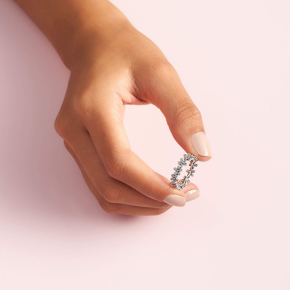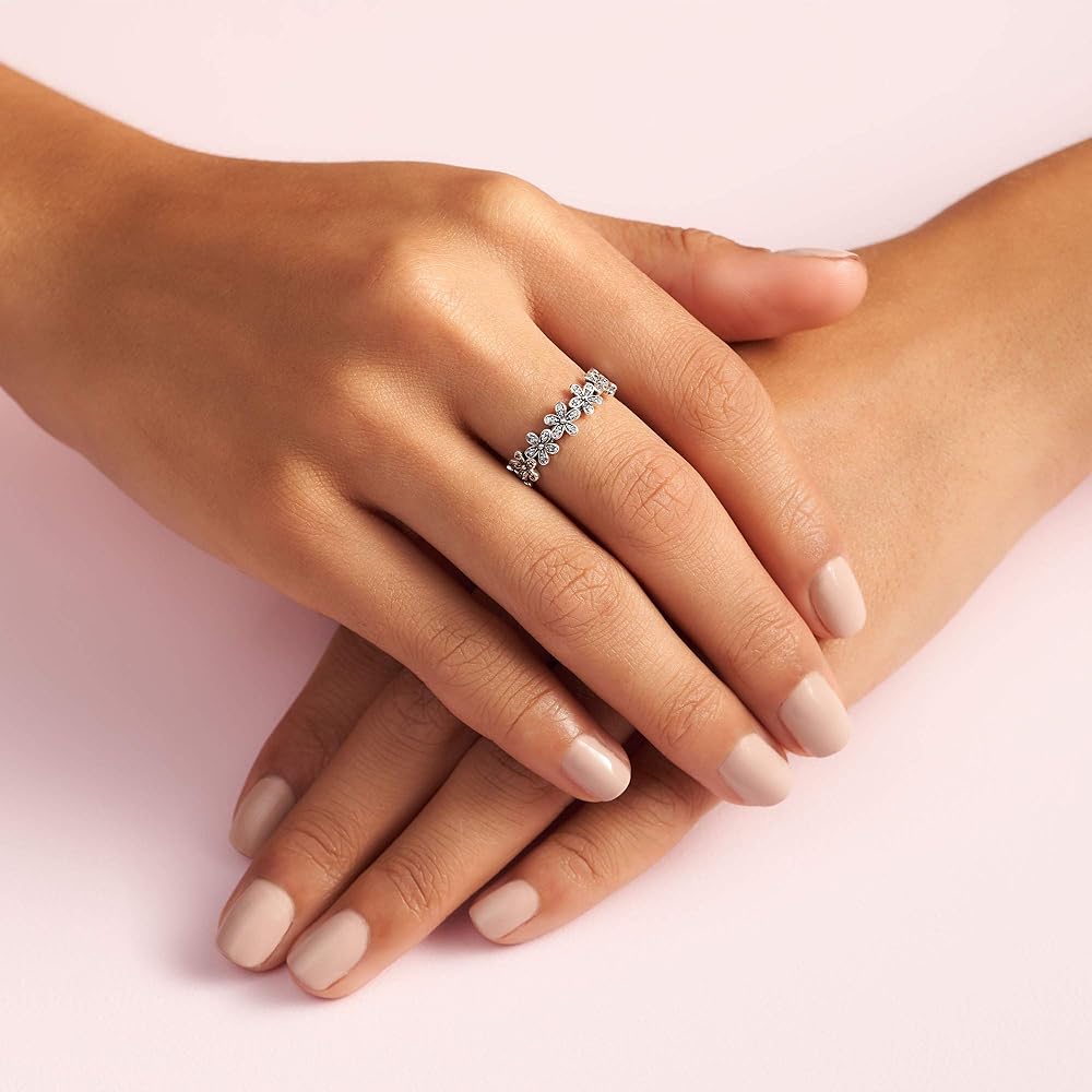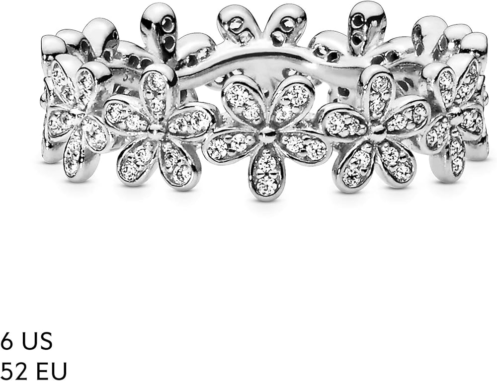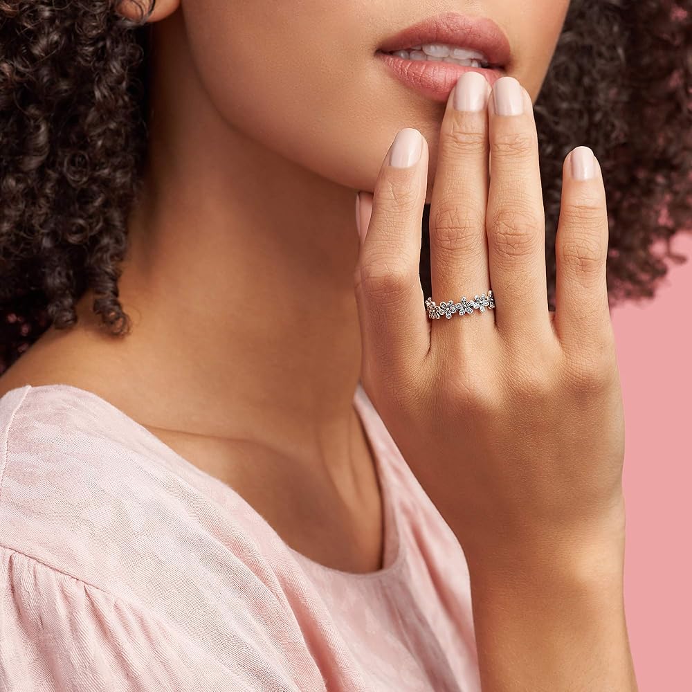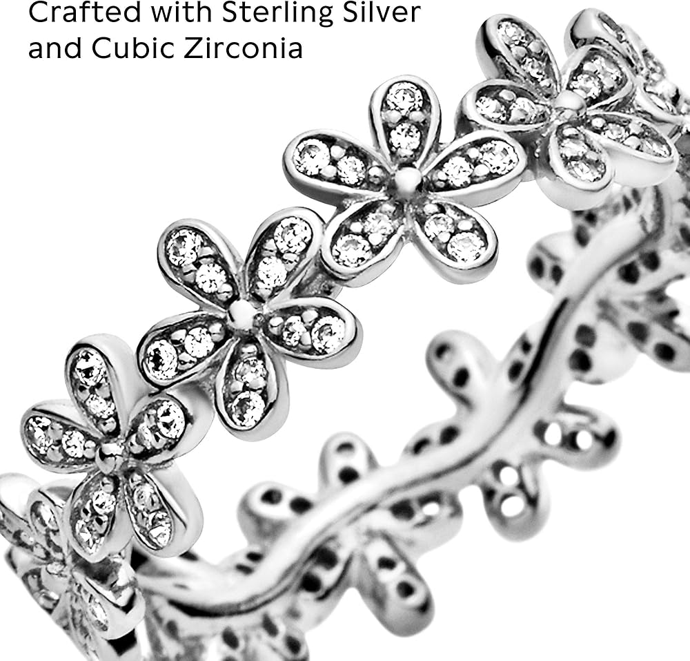 Wrap your finger in flowers with this dazzling Pandora daisy ring crafted in sterling silver. Evoking feelings of joy and happiness, the delicate chain of daisies is adorned with shimmering cubic zirconia stones that catch the light. Wear it solo for everyday elegance, or with the Pandora Daisy Earrings and matching necklace for a fabulous floral look.