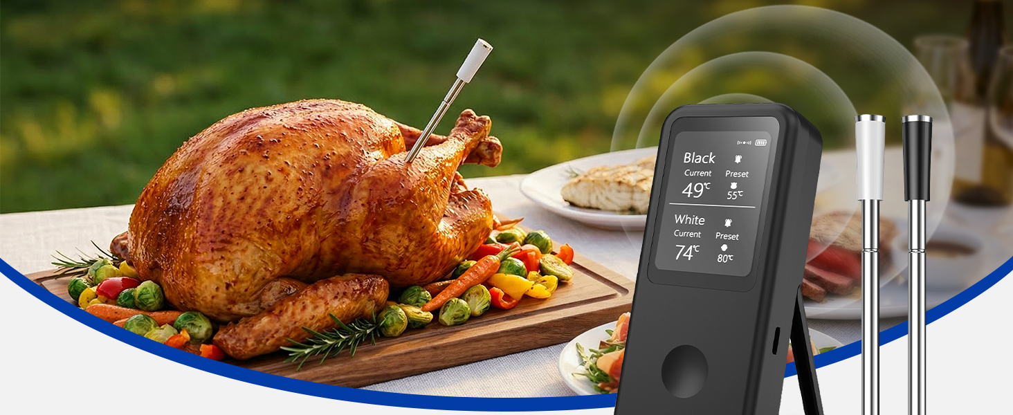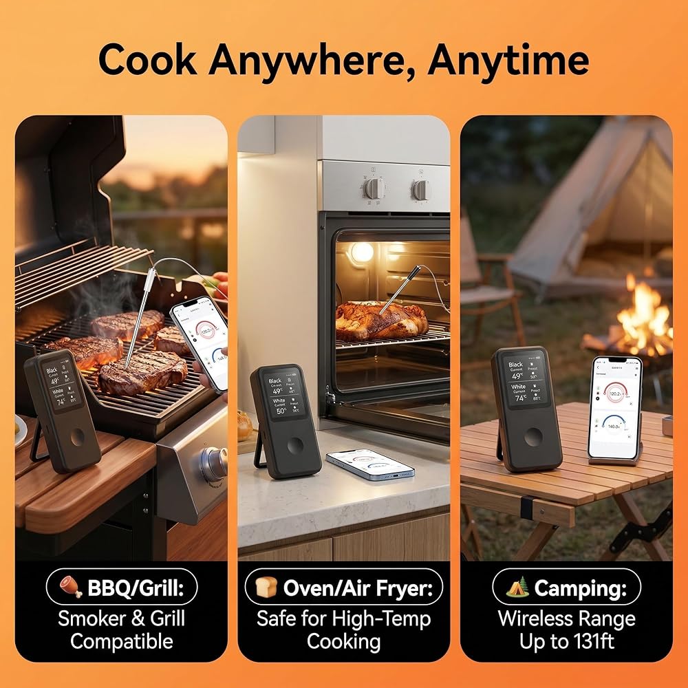 Dual-Probe Accuracy & Smart App Integration: Monitor two different cuts of meat simultaneously with the included black and white probes, perfect for managing both a steak and a roast at the same time. The free BFOUR App elevates your cooking with preset temperatures for 12 types of meat and customizable alarms. Ensuring consistent, perfect results