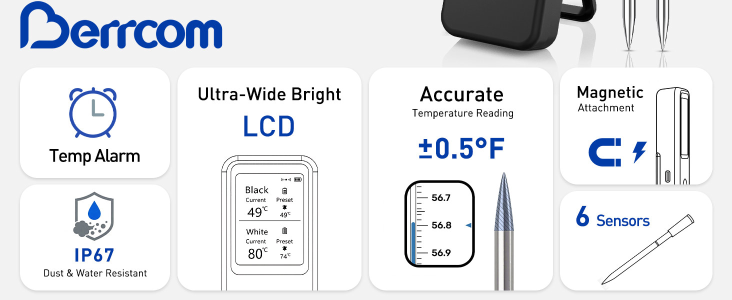 Versatile Cooking Options: Designed for versatility, the Berrcom wireless BBQ thermometer is perfect for use with grills, ovens, smokers, rotisseries, and kitchen roasts. Whether you're slow-smoking a brisket, hosting a backyard barbecue, or preparing a holiday feast, this multi-functional thermometer adapts to your cooking style, helping you achieve mouthwatering results with precision