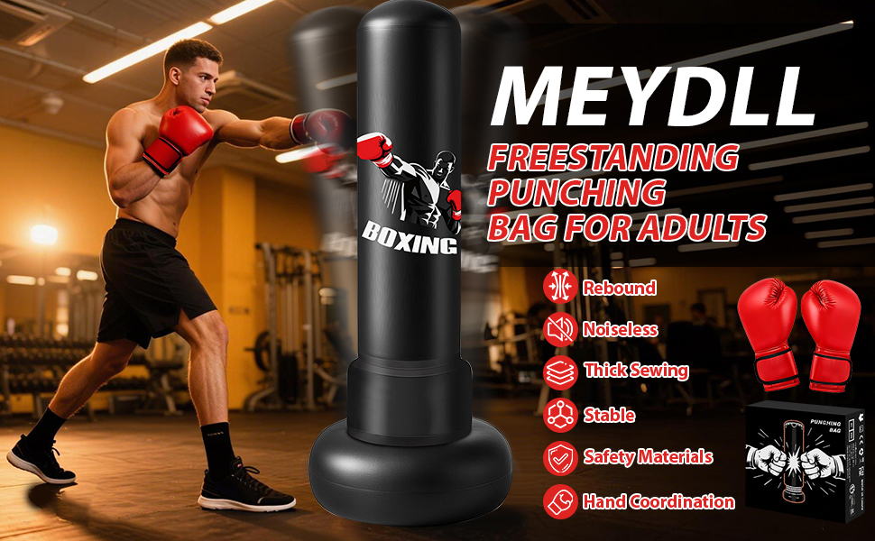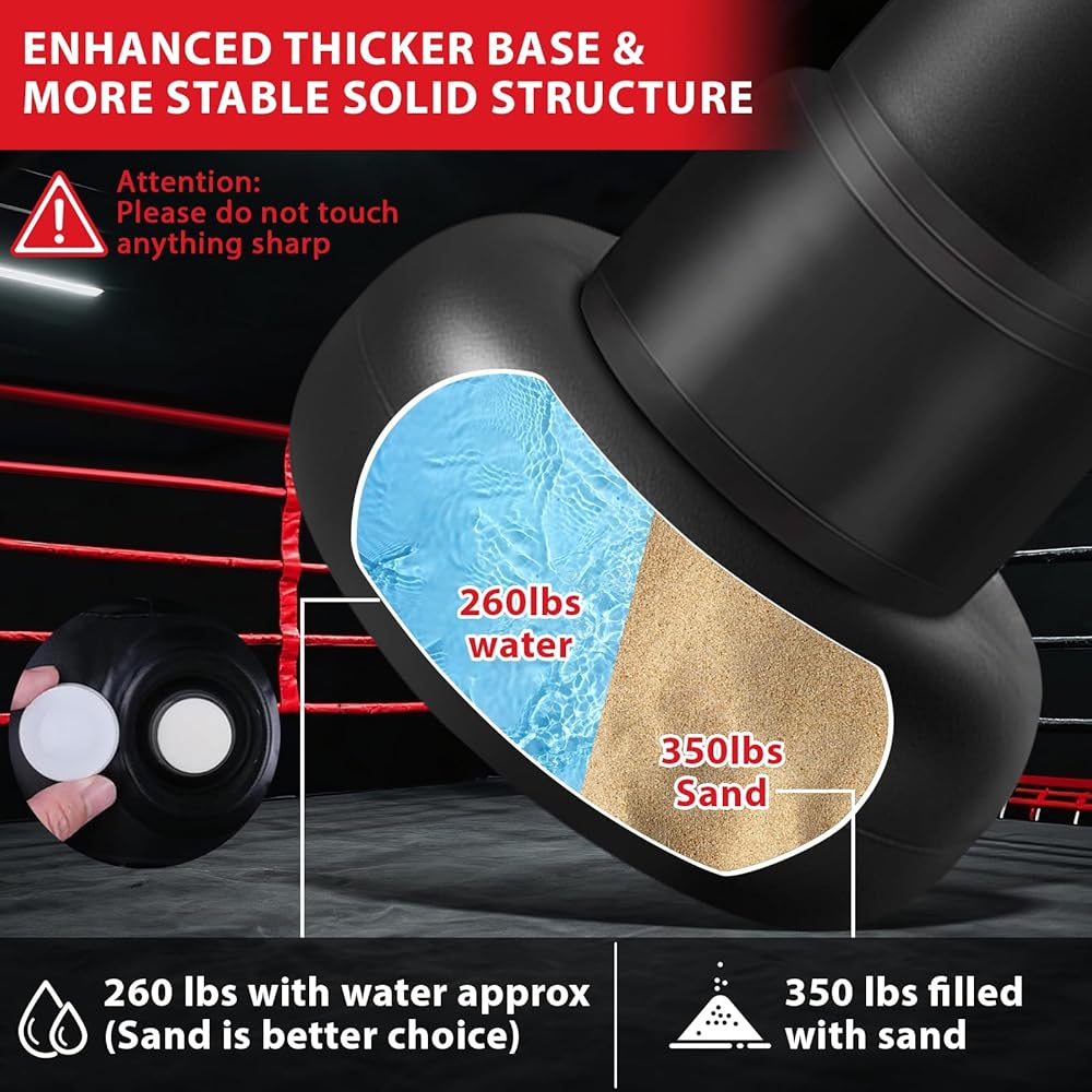 Upgraded Bigger Base Boxing Equipment Set:The standing punching bag's base has been widened to 29.5" to prevent wobbling or tipping during intense workouts. When filled, it can hold up to 260 lbs of water or 350 lbs of sand (sand offers superior weight distribution for added stability), keeping the bag firmly grounded whether you're practicing light jabs or powerful kicks.