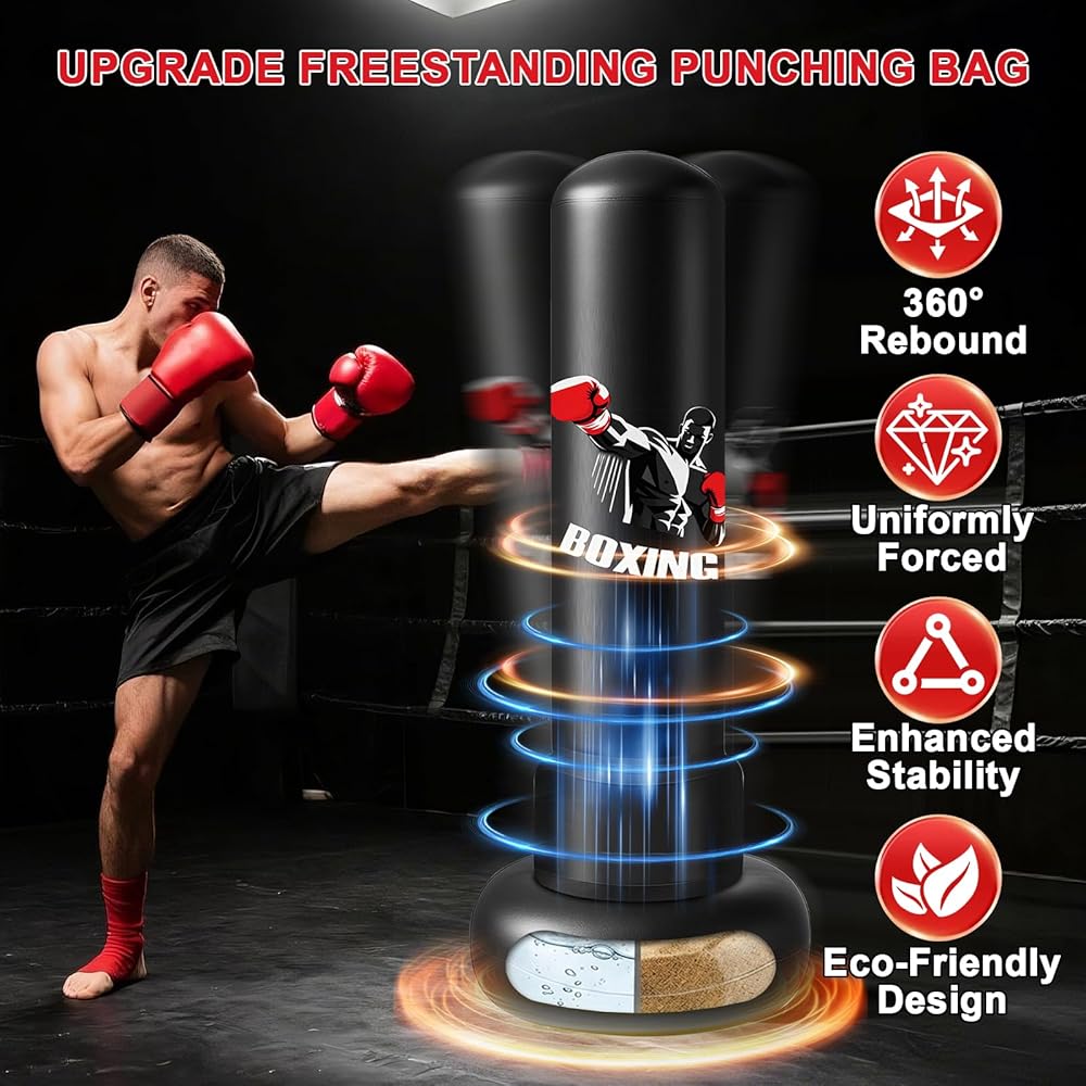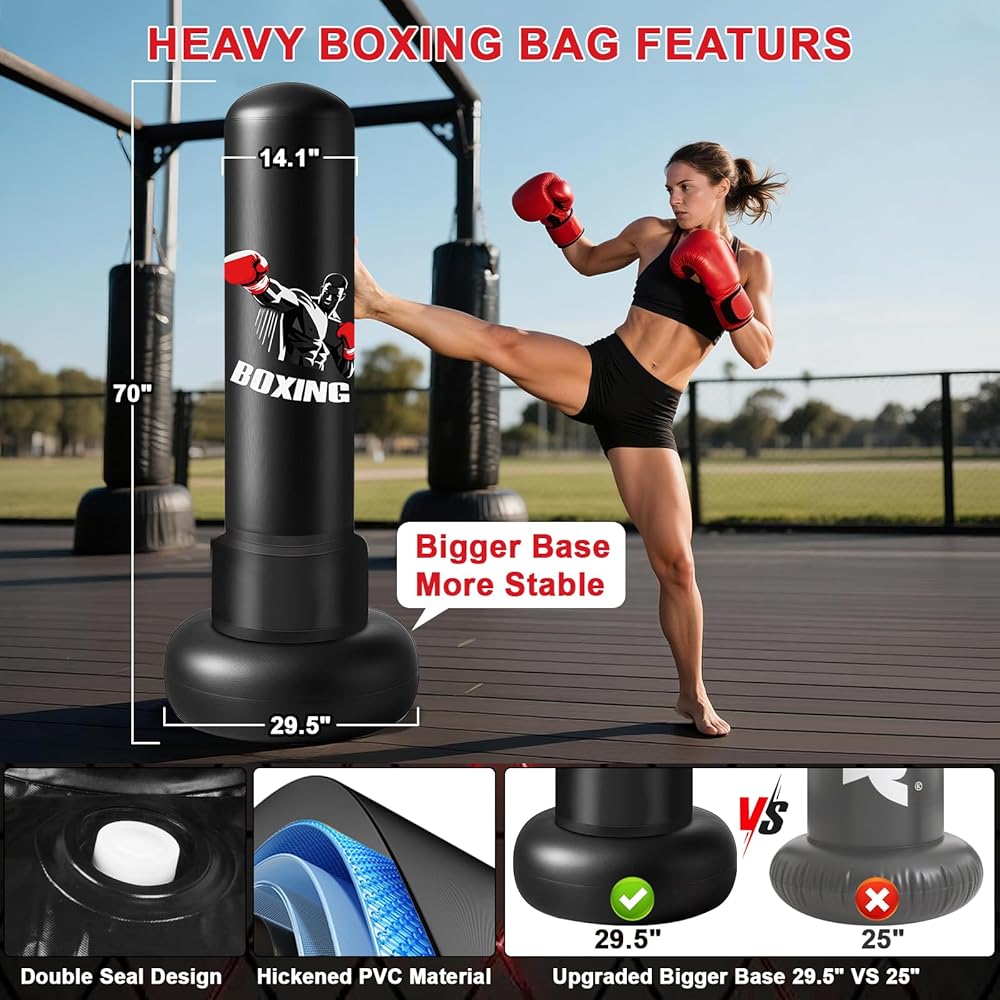 More Durable & Stable:70'' Heavy boxing bag crafted from thick,high-quality & tear-resistant 0.5mm PVC that is designed to withstand 10,000+ repeated strikes without cracking or damage.Its upgraded sealing technology ensures strong air retention, eliminating the hassle of frequent re-inflation and extending the product's lifespan—perfect for long-term and regular training.