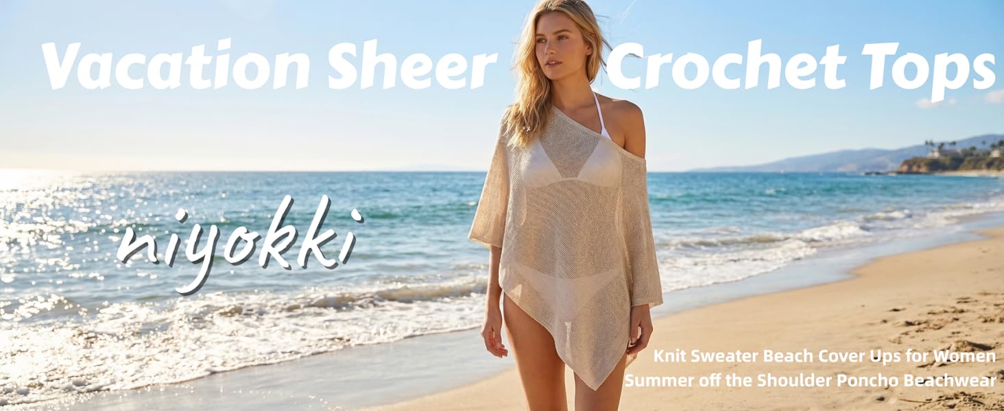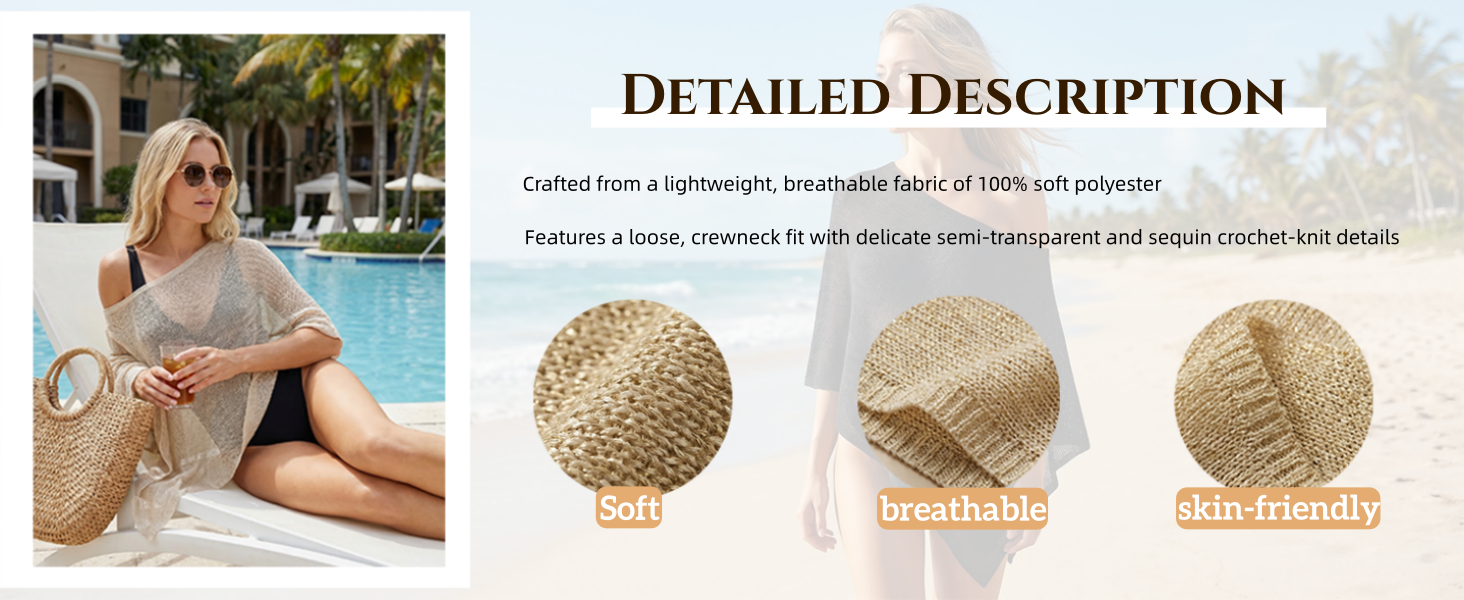【Material】Crafted from a lightweight, breathable fabric of 100% soft polyester, our women's beach coverup features a loose, crewneck fit with delicate semi-transparent and sequin crochet-knit details.
