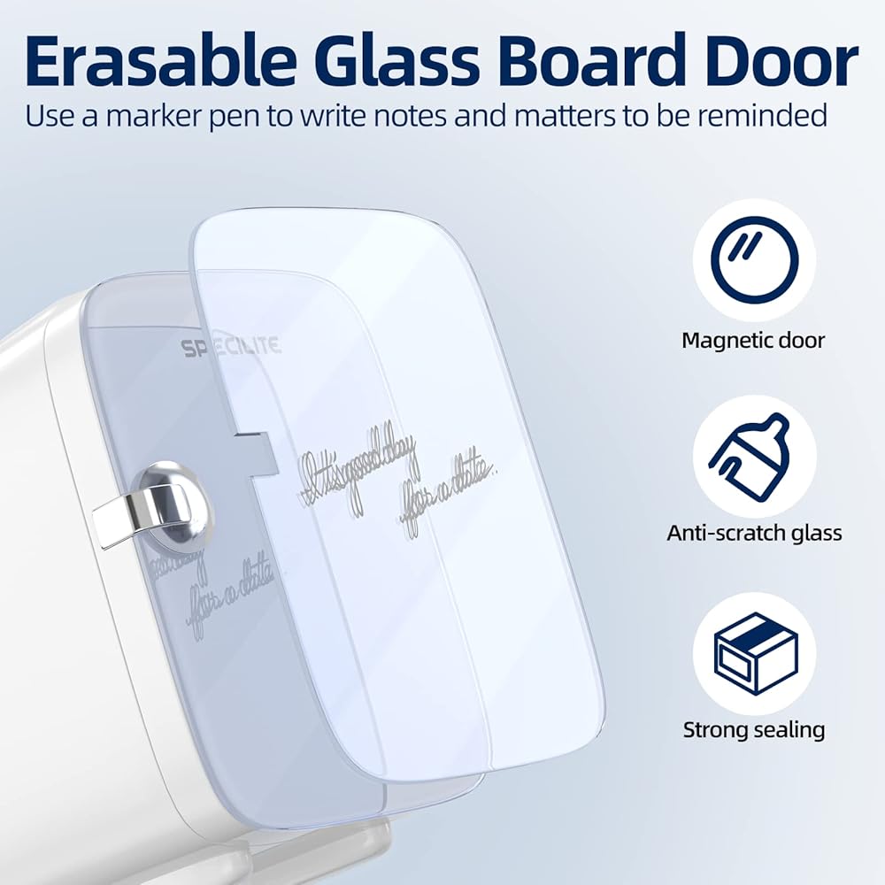 【Erasable Glass Board Door】Tight-fitting and magnetic door ensures strong sealing. Door surface is made of premium anti-scratch glass. You can use a marker pen to write notes and matters to be reminded on the cosmetic fridge door and it's easy to erase.