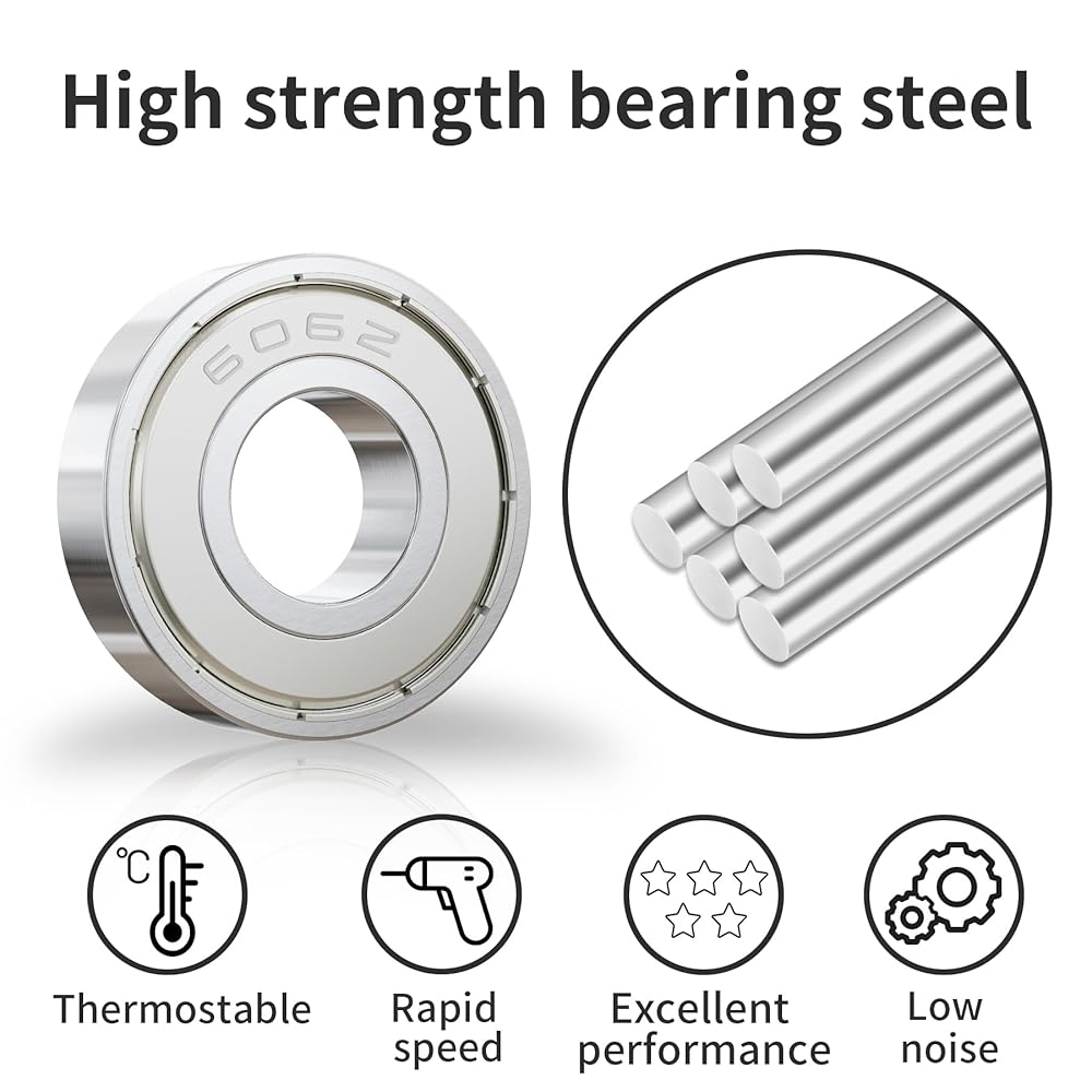 【Material】Crafted from premium high-carbon steel, our deep groove ball bearings feature high-carbon steel balls and stamped steel retainers. The robust metal dust shields enhance durability, allowing these bearings to withstand heavy loads and rigorous use
