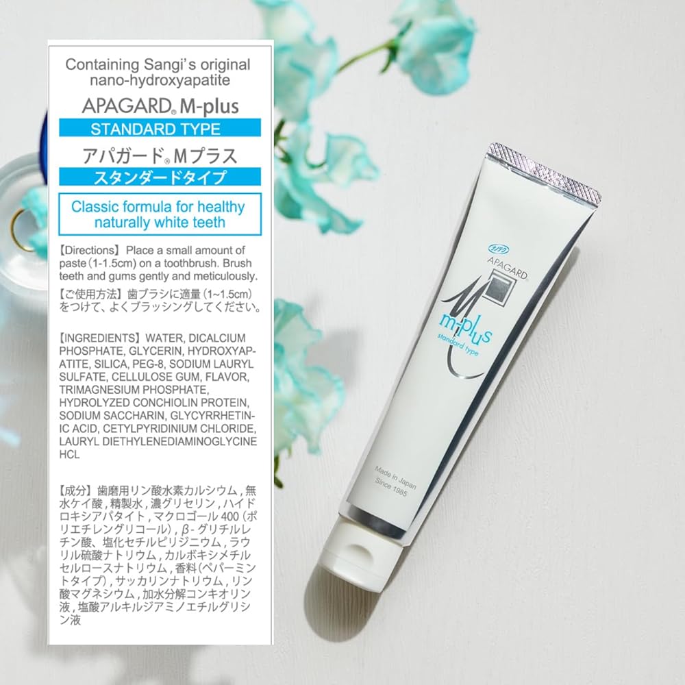 Ingredients (INCI name): AQUA, DICALCIUM PHOSPHATE, GLYCERIN, HYDROXYAPATITE, SILICA, PEG-8, SODIUM LAURYL SULFATE, CELLULOSE GUM, AROMA, TRIMAGNESIUM PHOSPHATE, HYDROLYZED CONCHIOLIN PROTEIN, SODIUM SACCHARIN, GLYCYRRHETINIC ACID, CETYLPYRIDINIUM CHLORIDE, LAURYL IETHYLENEDIAMINOGLYCINE HCL