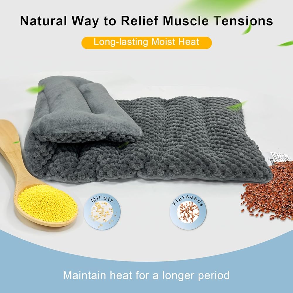 Weighted Therapy with Even Heat Distribution: Filled with 100% natural flax seeds and millet, this clay heating pad microwavable provides gentle, weighted comfort. The sectioned chamber design ensures the filling stays evenly distributed, eliminating cold spots for consistent moist heat. Unlike traditional rice bags for heat therapy microwavable, our blend retains warmth longer, offering lasting relief.