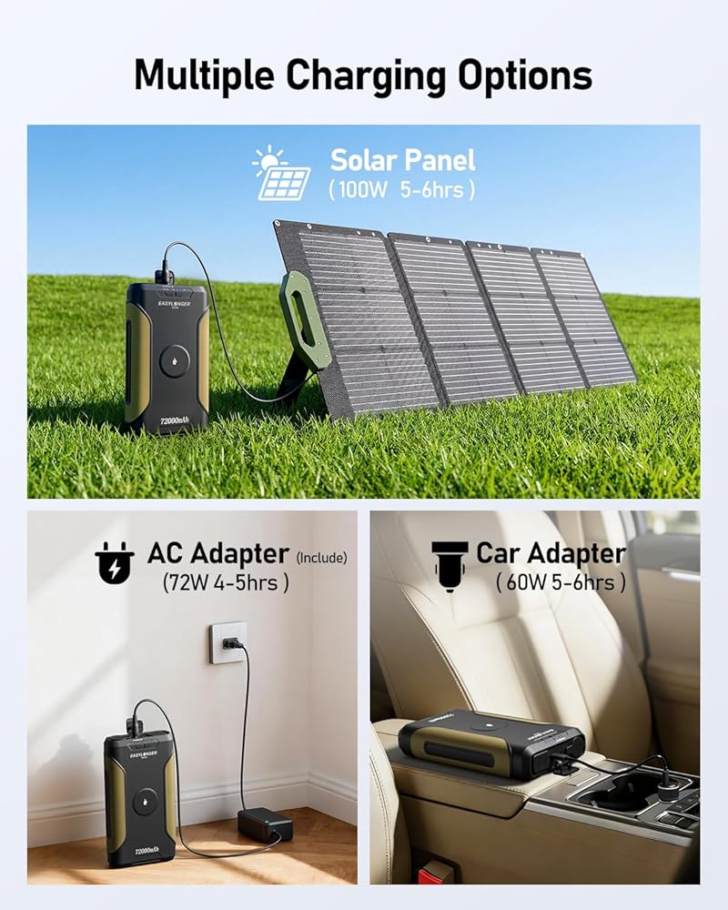 Four Rapid Recharge Options: 1) 72W AC adapter (4–5 hrs), 2) 60W USB-C PD charger (4.5–5.5 hrs), 3) 100W solar panel (4–5 hrs), 4) Car outlet via cigarette lighter with 18–24V converter (4.5–5.5 hrs). Includes LED light with SOS function.
