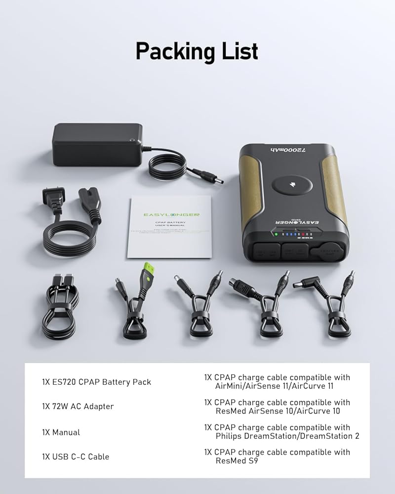 Package List: 1×CPAP battery, 1×Handy Bag, 1×AC adapter, 1×DC Cable for ResMed S9, 1×DC Cable for AirSense 10/ Aircurve 10, 1×DC Cable for AirMini/ AirSense 11, 1×DC Cable for Philips DreamStation, 1×USB C-C cable, 1×USB A-C cable, 1×User Manual