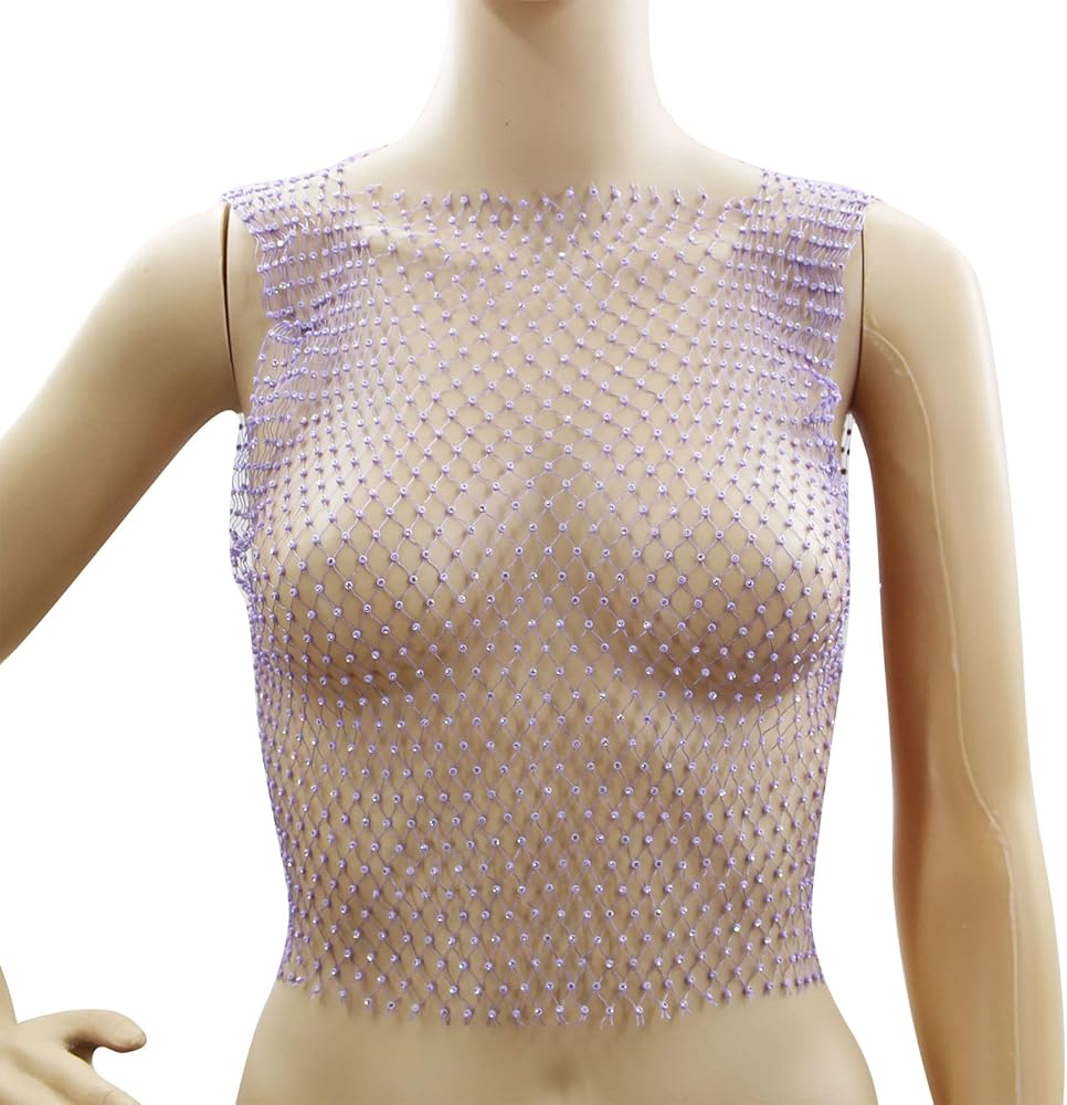 Diamond Mesh Tank Top Women Hollow Out Elastic See Through Rhinestone Crop Tops