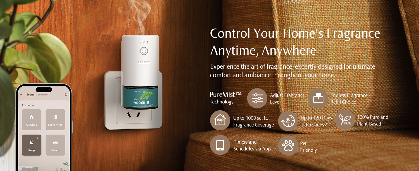 Covers up to 1000 sq. ft.: Simply plug in this essential oil diffuser plug in and effortlessly fill every corner with captivating scent. Works as a room air fresheners plug in for bedrooms, living rooms, and large open spaces. Customize with four adjustable scent intensity levels and spray intervals of 1, 2, 6, or 10 minutes for fully personalized fragrance control