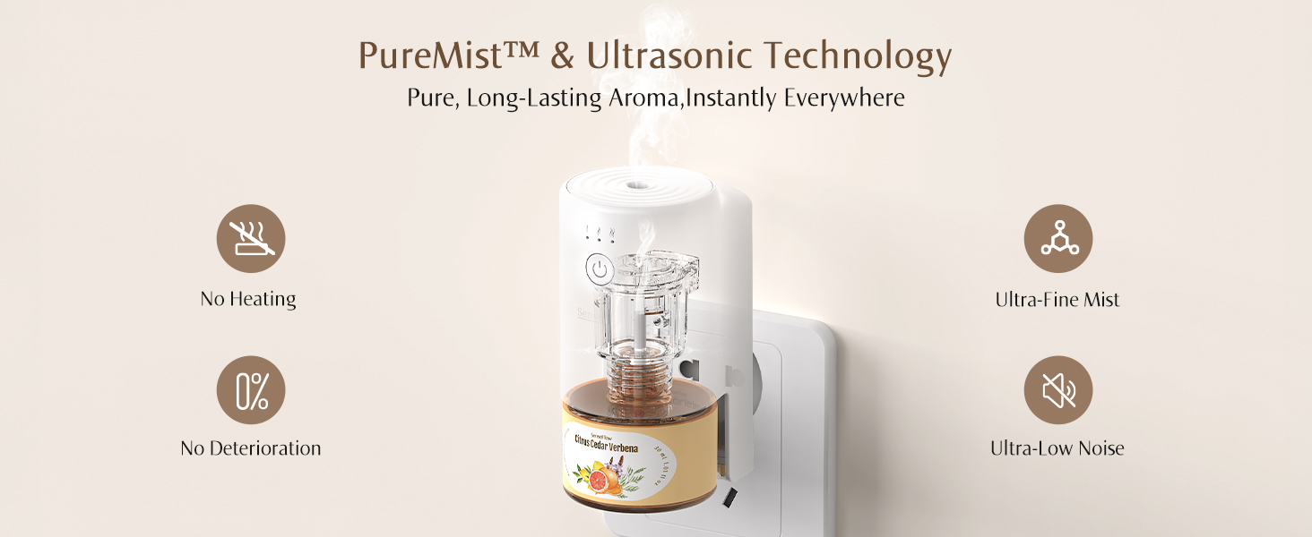 Embrace PureMist Patented Natural Health Fragrance Technology: Our precision-engineered ceramic discs and driver chips directly atomize essential oils, preserving their full, natural scent. Unlike conventional oil diffusers or standard air freshener plug in products, PureMist is a non toxic diffuser for home — no heat, no water, no chemicals — delivering a safe, ultra-quiet, and truly immersive fragrance experience