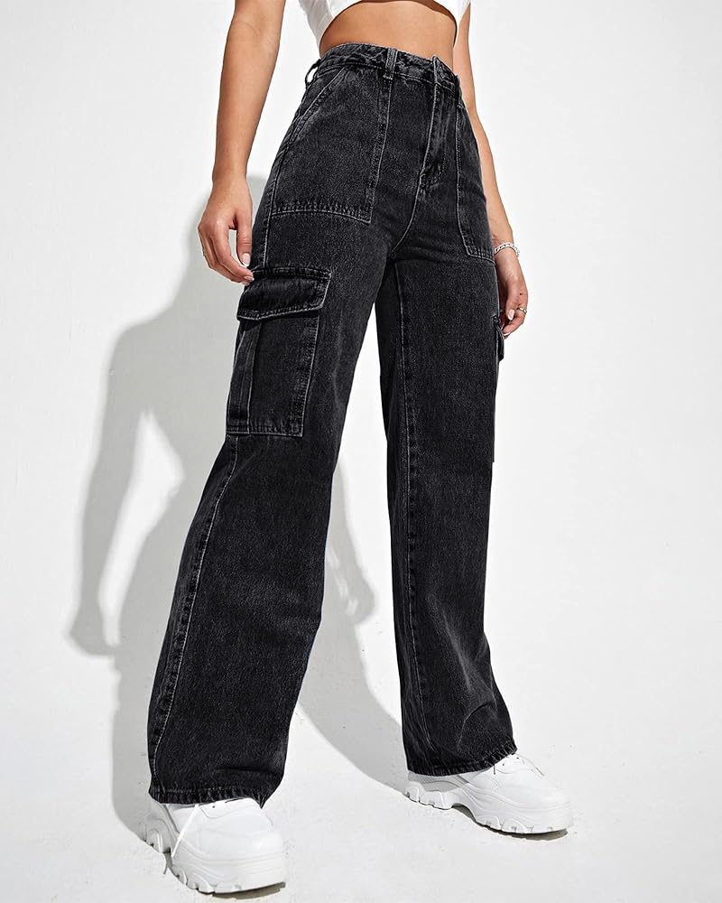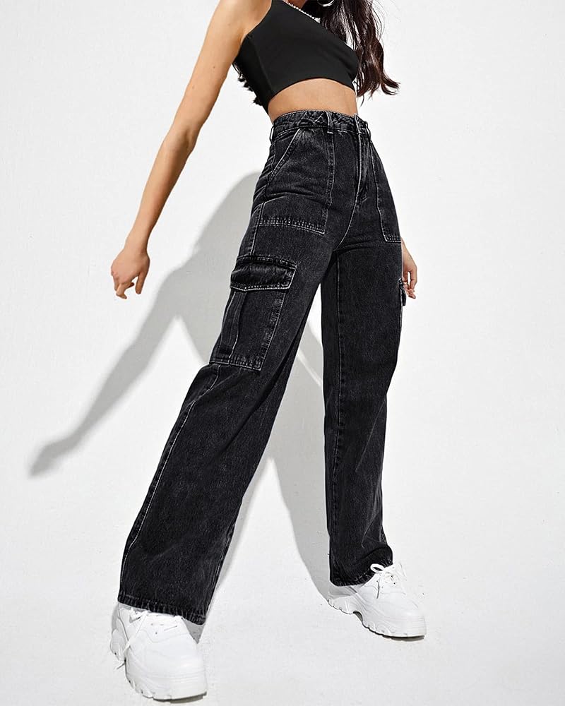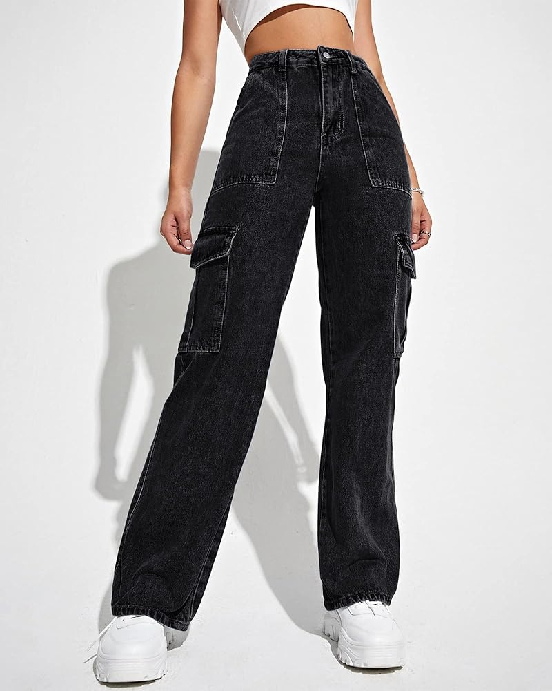 【High Waisted Flap Pocket Side Cargo Jeans】: Casual loose cargo pants y2k women, High waist, 6 multiple practical and functional pockets, Straight leg cargo pants, relaxed fit, zipper and button closure, vintage cargo jeans will make you look fashion, It is a good Y2K Streetwear Pants.