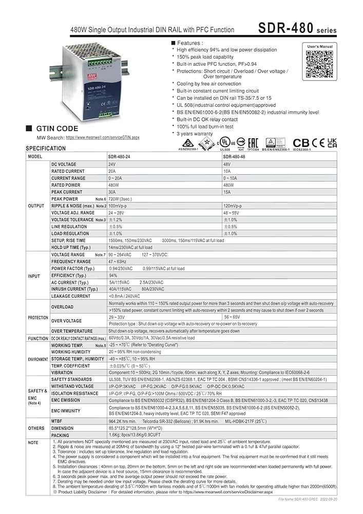 - SDR-480-24 480W Single Output Industrial DIN RAIL with PFC Function SDR-480 24V 20A