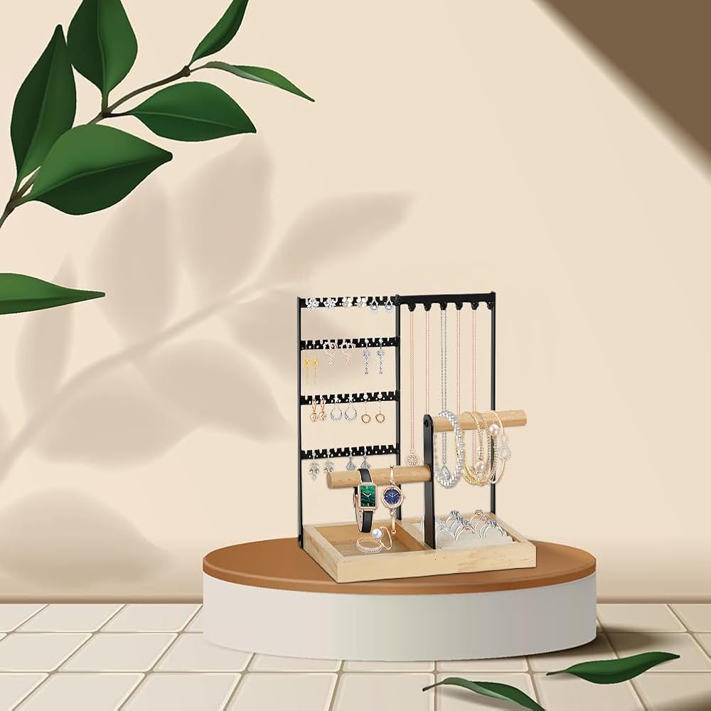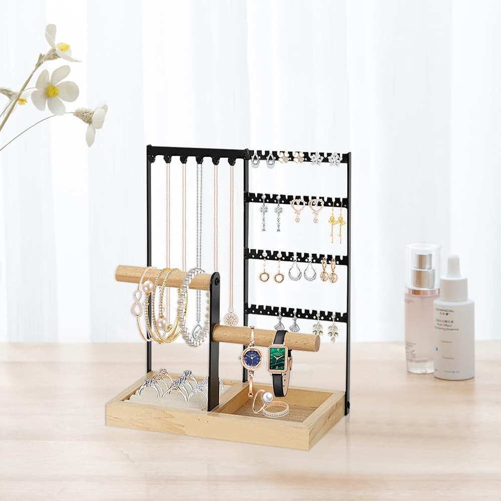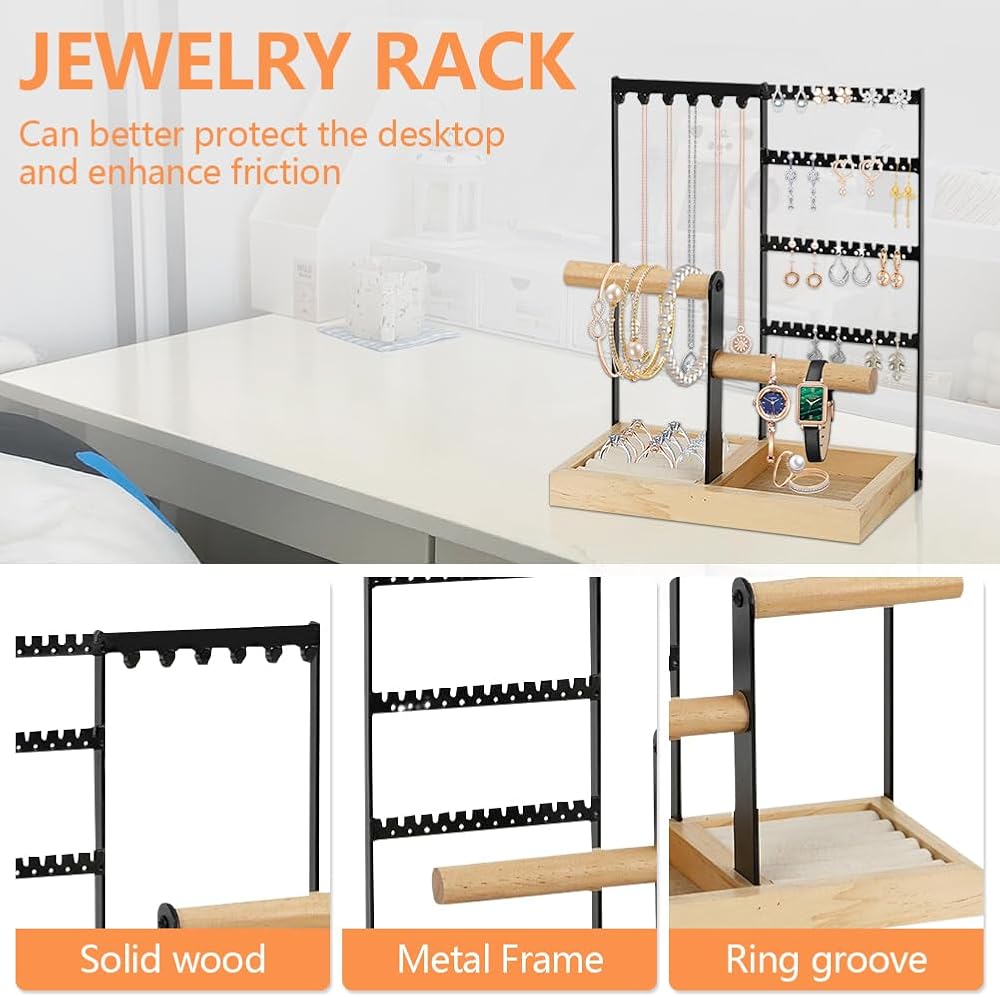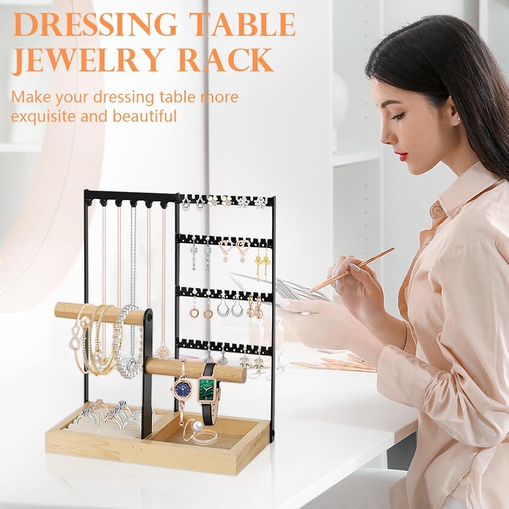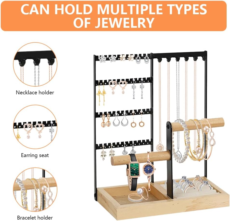 Jewelry Stand, 4-Tier Earring Holder Organizer with 48 Holes and 6 Necklace, Holder Bracelets Holder & Wood Box for Rings, Mothers Day Gifts for Mom Black