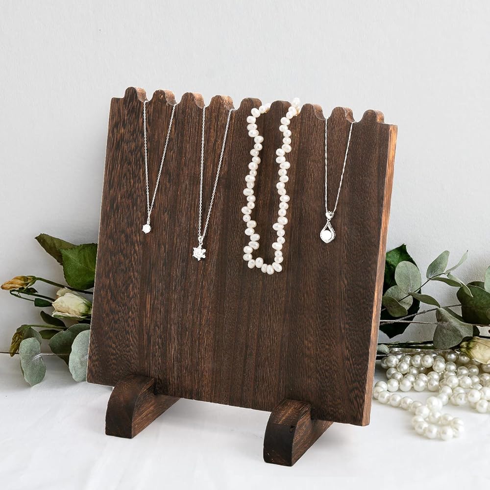 Package includes 2 pack wood jewelry display stand. Overall Dimensions: 9.4" W x 9.8" H. Each board could hold up to 8 necklaces.