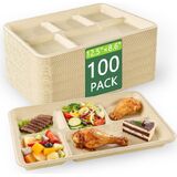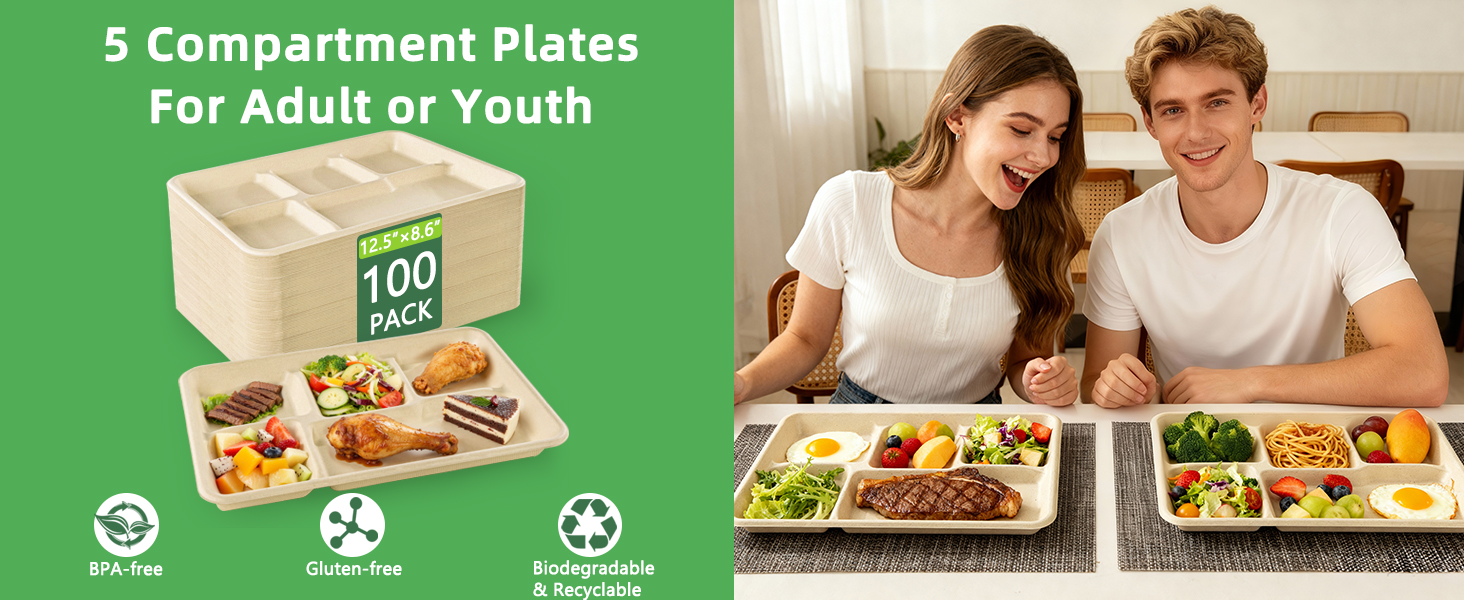 【Compostable 5-Compartment Plates】This 12.5 inch ×8.6 inch divided plates for adult/ youth is thoughtfully designed to hold a main dish, three sides, and dessert or fruit, effectively separating flavors for an enhanced dining experience. Compared to other 5-compartment plates, this larger version can hold more food, making it ideal for main meals.
