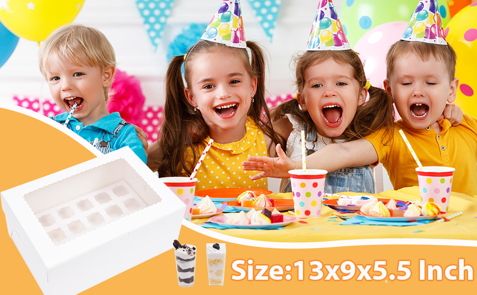 Package includes: 12 Pcs 13x9x 5.5 inches white dessert shooter boxes and 12 pcs slots. Each box can hold 24count 3 oz square and round shooters.Each tray measures 12.9in x 8.9in with slots of 1.4"x1.4", accommodating a variety of bite-sized treats.