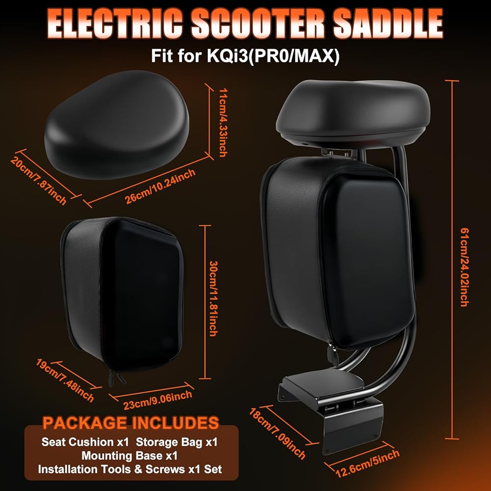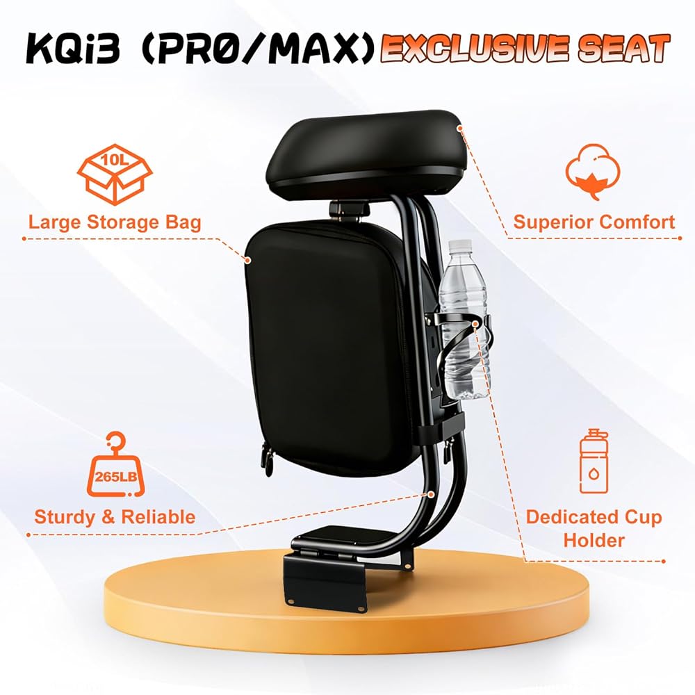 Upgrade Your Ride: Ultimate Comfort & Convenience for Your 2019-2024 KQi3, KQi3PRO, KQi3MAX Electric Scooter Tired of standing through your entire commute? Transform your KQi3 electric scooter into a comfortable, sit-down cruiser with our premium Scooter Seat Attachment. Designed for the modern rider who values both practicality and comfort, this all-in-one accessory is the perfect solution for longer journeys, daily commutes, and effortless errand-running. Key Features & Benefits: Precision Engineered Compatibility: Rest assured, this seat attachment is meticulously designed for a perfect fit with the KQi3. It installs in minutes with a secure, wobble-free connection, guaranteeing a safe and reliable ride every time. Unmatched Riding Comfort: Say goodbye to rider fatigue. Our seat features a thick, high-resilience PU leather cushion that provides superior support and comfort. The ergonomic design allows you to enjoy extended rides with ease, making every trip a pleasure. Integrated Storage Solutions: Never choose between carrying your goods and a comfortable ride again. This attachment comes equipped with a spacious 10L storage bag to hold your backpack, groceries, or gym gear, plus a secure cup holder for your favorite coffee or drink. Your journey just became hands-free and infinitely more convenient. Built to Last: Constructed from a high-strength aluminum alloy rod and reinforced steel mounting hardware, this seat is engineered for durability and stability. It confidently supports adult riders and is built to withstand the rigors of daily use, ensuring your investment is protected. Transform your electric scooter experience. Add to your cart today and rediscover the joy of riding!