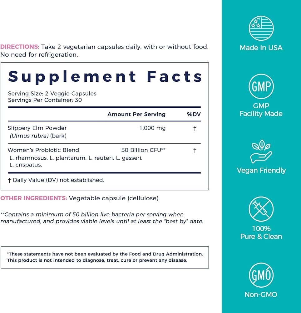 100% Natural, Non-GMO, Gluten Free: NewRhythm Slippery Elm+ Women's Probiotics is Formulated with 100% Natural Ingredients and Independently Tested in the USA. Our Supplements are Verified NON-GMO, Gluten Free, and Verified Free of Sugar, Soy, Yeast, Egg, Wheat, Corn, Peanuts, Fish, Shellfish, Magnesium Stearate, Artificial Ingredients, Fillers, Binders, and Preservatives