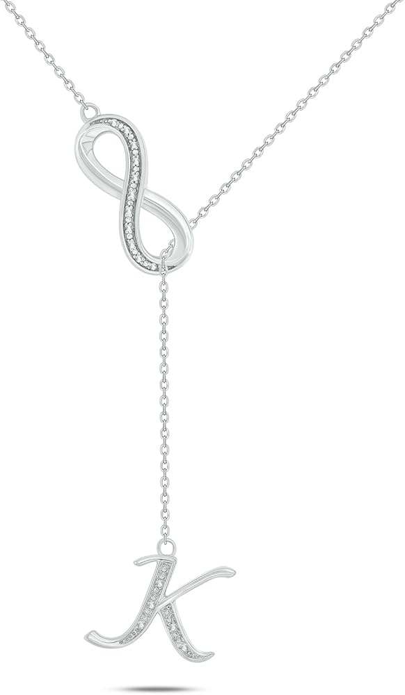 Diamond Infinity Lariat Necklace for Women in 925 Sterling Silver, Women's Silver Alphabet Pendant Necklace with Diamond Accents Available in Letters A To Z, 20" Cable Chain