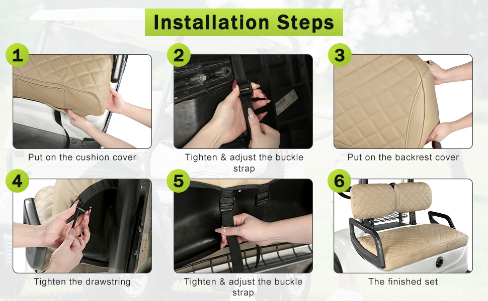 VINYL LEATHER GOLF CAR SEAT COVER: The material is made of vinyl polyurethane leather, soft and comfortable, scratch-resistant, stain-resistant, and durable; The Golf cart leather seat cover is easy to clean and care for, and it can be easily wiped clean directly with a wet wipe, no need to wash.