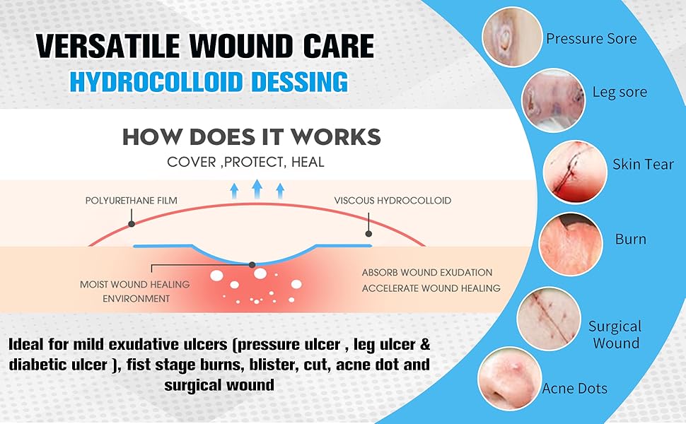 Versatile Wound Dressing Care: Ideal for mild exudative ulcers (pressure ulcer , leg ulcer & diabetic ulcer ), fist stage burns, blister, cut, acne dot and surgical wound