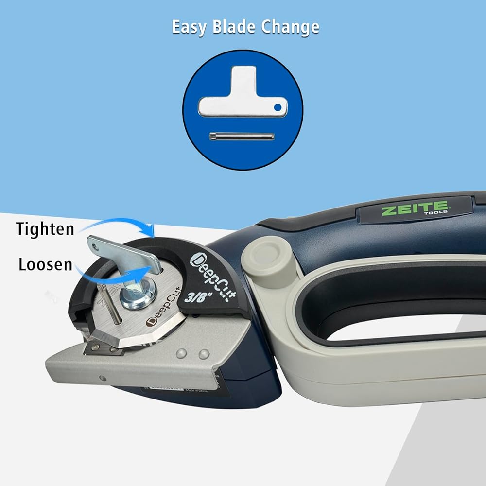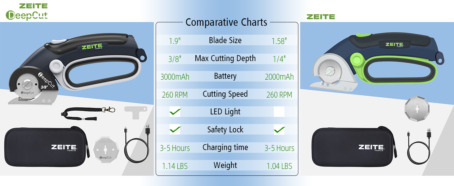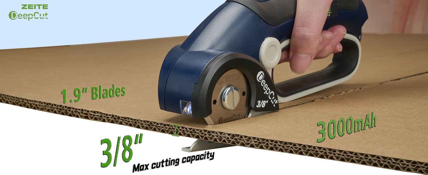 MAX 3/8" CUTTING CAPACITY: ZEITE Deepcut 4V electric scissors features a powerful motor and a 1.9-inch HSS blade, cutting through materials up to 3/8 inches thick with ease. Comparing with 1/4" scissors, it is upgraded and can break down thicker materials such like triple-wall corrugated cardboard,TV boxes,fabric,leather,carpet...