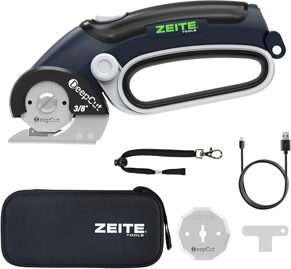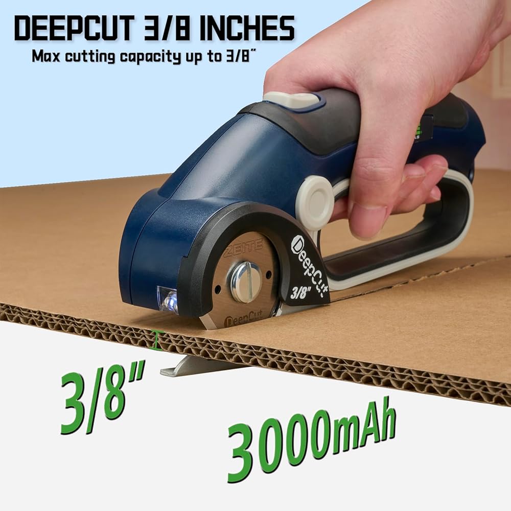 ZEITE Deepcut 3/8" Electric Cardboard Cutter,Cordless Scissors with LED Light,Storage Box,Rechargeable Powerful Rotary Box Cutter with 2 Blades for Thick Cardboard, Fabric, Carpet, Leather