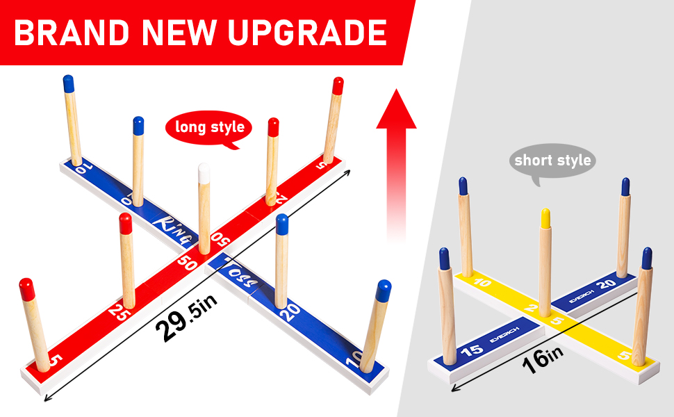Upgraded Ring Toss for More Fun: Offers a large 30-inch retractable base with 9 scoring sticks and 20 Rings of 4 types . The addition of small plastic rings and more scoring sticks provides a longger toss time .