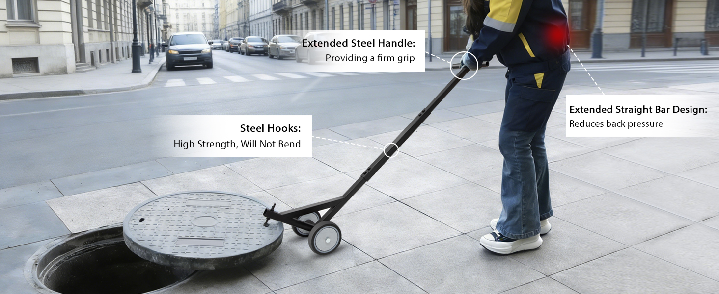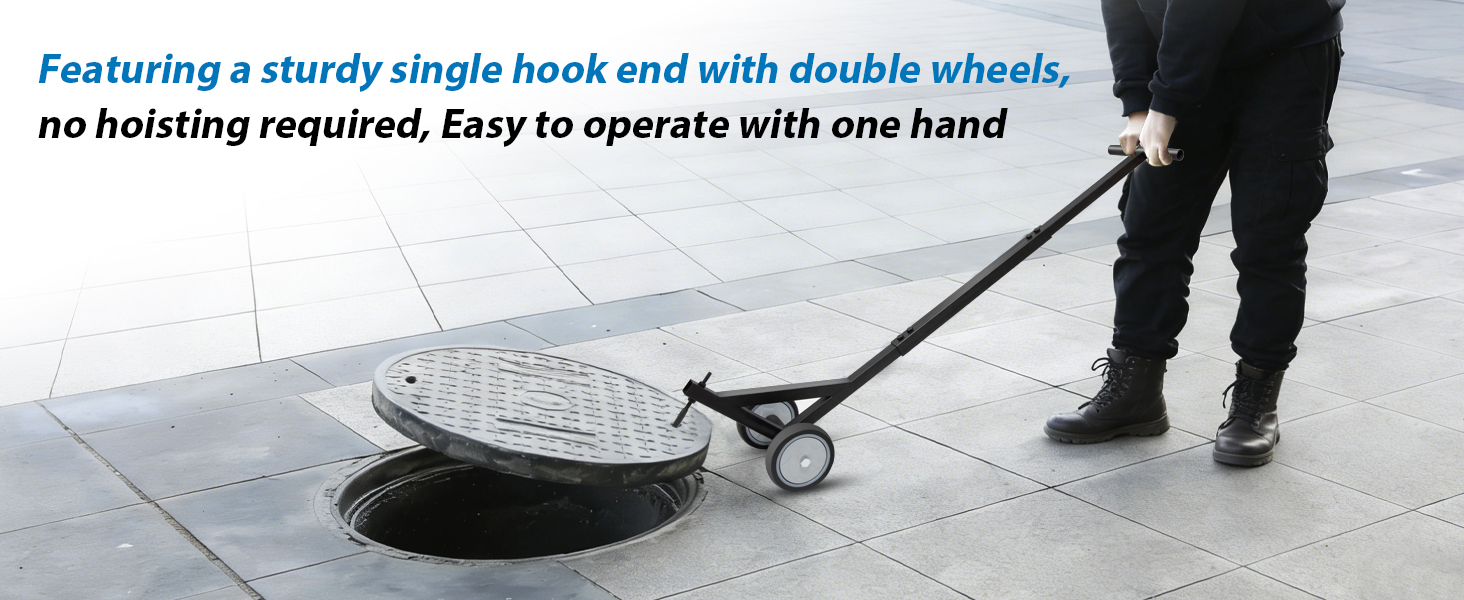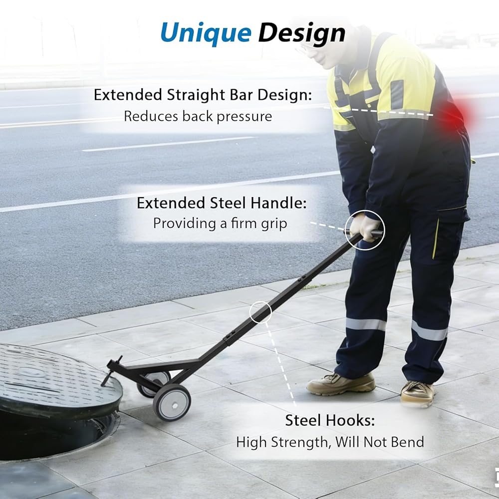 Heavy Duty Manhole Cover Hook: Featuring a sturdy single hook end with double wheels, Open manhole covers, no hoisting required, one person can easily handle it. Ideal for lifting heavy-duty storm drain covers, steel manhole covers, and septic tank covers.