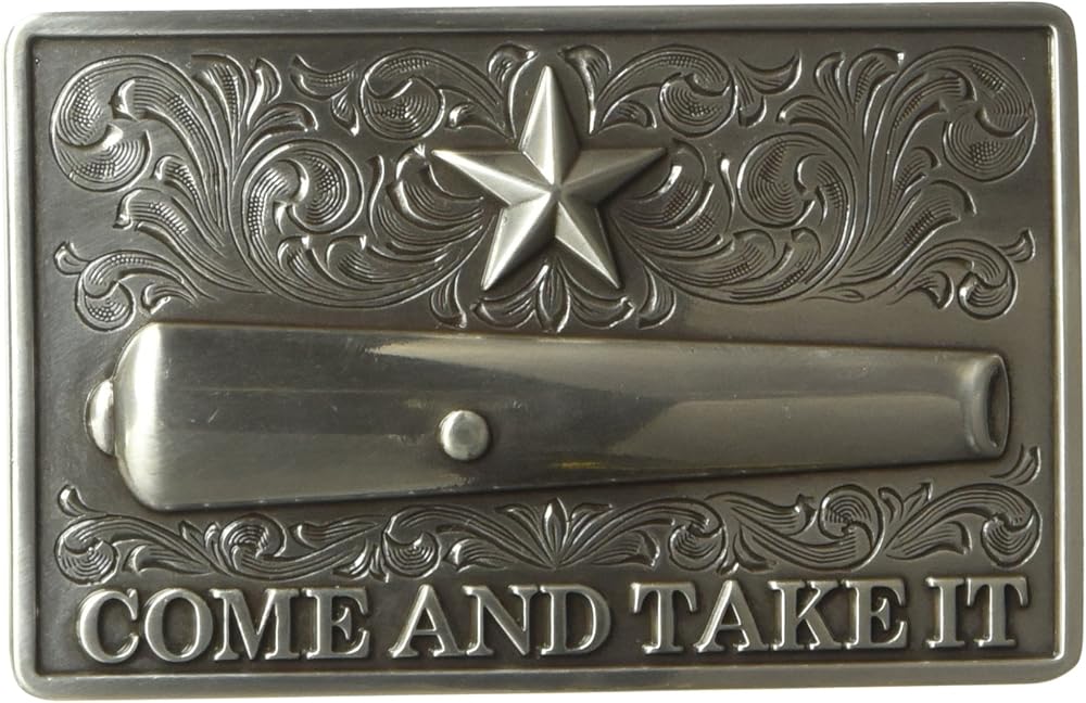This Nocona men's buckle by medium and f western products features a smooth edge rectangle shape with western scroll and star at the top and a cannon with the words come and take it on the bottom. Measures 3-3/8 x 2-1/8.