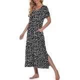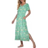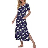 【Features】: The elegant sleep dress is the perfect casual look with full length that shapes a v-neckline, short sleeves, and pockets. Loosely-fitted silhouette ends at hem with twin side slits that make this dress easy to move around in! Handy side seam pockets make this sleepwear as functional as it is chic! Comfort and style come together perfectly with this long nightgown that has contrast color trimmed at the neck, cuff.