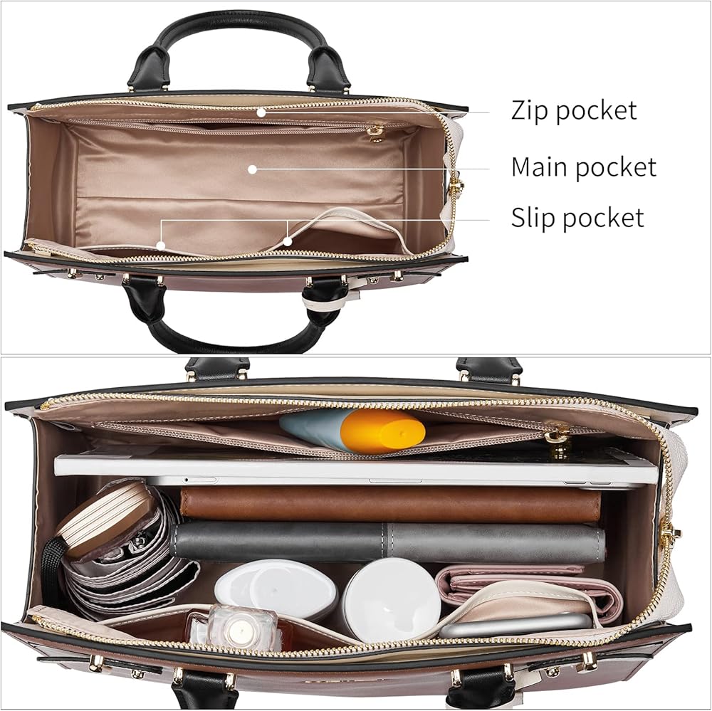 Large Capacity--Interior structured with a main compartment, 1 inner zipper pocket, and 2 slip pockets. Inner space is large enough for hold IPAD, makeup bag, and wallet. Exterior 1 back pocket with zip closure, easily taking small things such as cell phone, lipstick keys, money, card, checkbook or more.