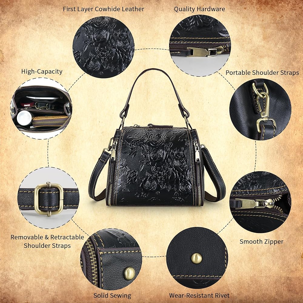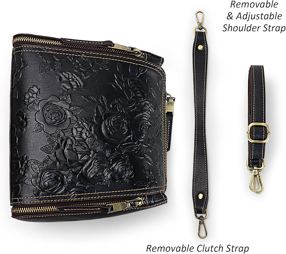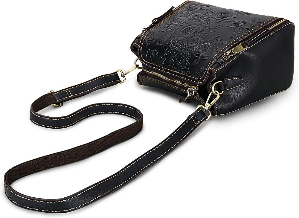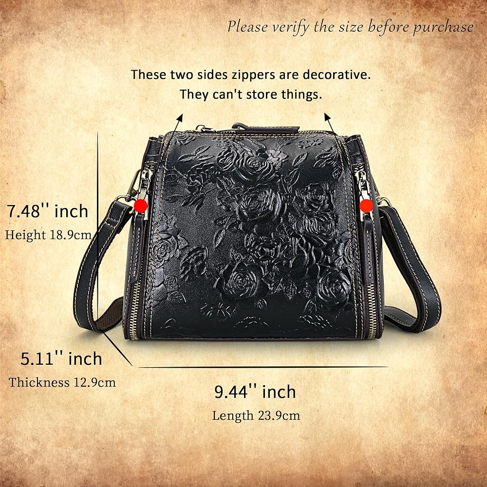 Feature: High Qualtiy Leather. It's a vintage design crossbody bag with embossing rose pattern. Functional for daily use, enjoy parties, go traveling, etc.