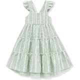 Summer girls dress, shoulder halter fly sleeve design, backless, lower pleated stacked dovetail hem, unique and chic, skirt overall embroidered floral design is especially suitable for summer wear.