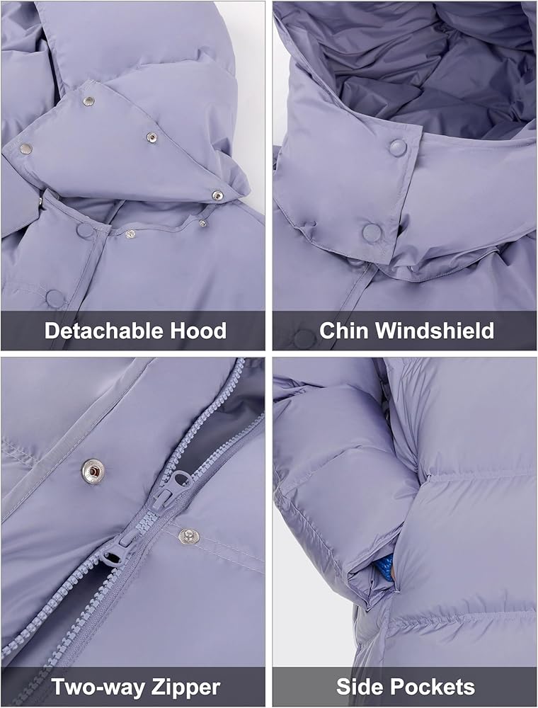 Thoughtful Details: This puffer coat for women features 2 side pockets for storing your phone, keys, or small accessories; Easy and versatile with a two-way zipper; Chin windshield for extra protection and warmth; Detachable hood for versatility.