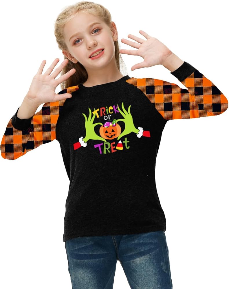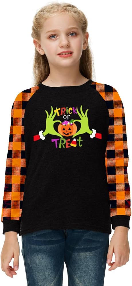 Hocous Pocus Shirts Features Orange and Black Plaid Raglan Sleeve For Regular Fit, Vibrant Halloween Holiday Graphic Prints: Pumpkin Face, Dancing Pumpkin, Spooky Skeleton, Cute Ghost and So On. Add Fun to Boys and Girls' Vacation Wearing.
