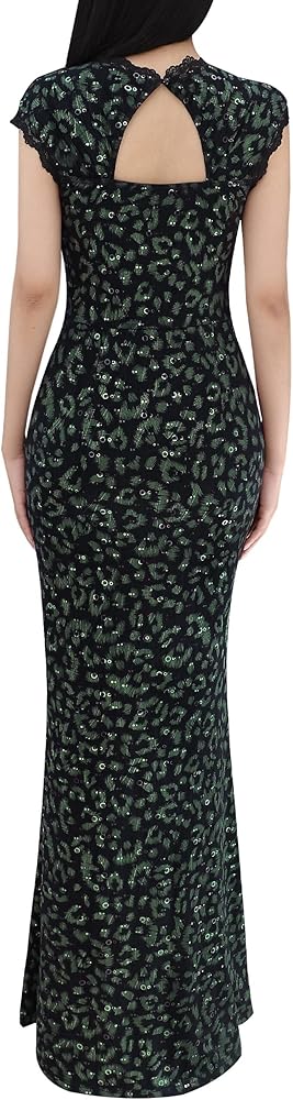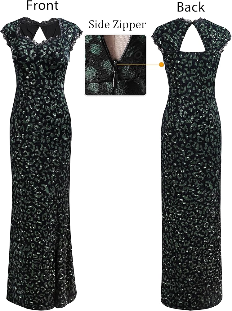 Style: Scallop Sweetheart Neckline, Decorative Lace Trim embellished at neckline and cuff, Cap Sleeves, Keyhole Back with Button Closure, Graphic Printed with Sequin, A Conceal Side Zipper, Slim Fit, Maxi Length, High Slit front with Adjustable Zipper [The adjustable zipper allows you to zip or unzip the slit so you can decide how much leg you want to show.]