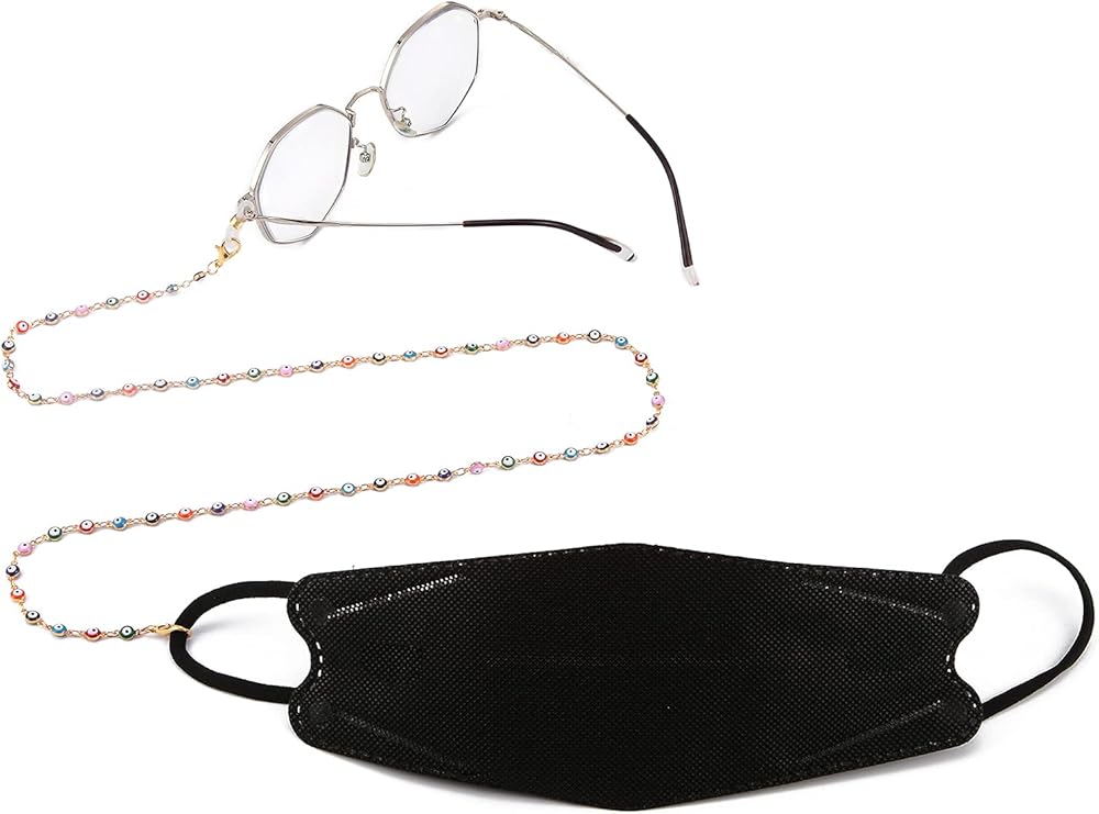[Adjustable Size & Comfort ]--Two size: One chain is 29.92" length with 0.17 " blue evil eye beads. Another is 25.59" with 0.19" multi-colour evil eye beads. With specially designed adjustable universal connectors, the anti-slip loops will securely and snugly hold on to your glass.es. Never worry about losing your glasses again. Wearing it, there are no any pain and no tarnish on your neck