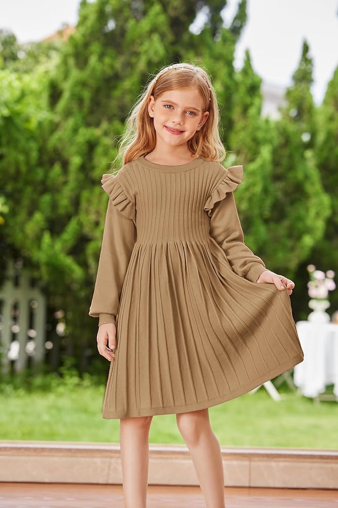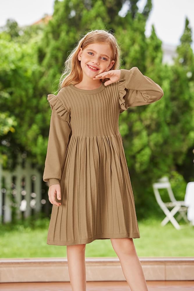 Simple&Unique: Danna Belle's girls sweater dress, Features crew neck, Ruffle, high quality knitted fabric, solid color and long Lantern sleeve design will make your girl become an EYE-CATCHING star in the crowed; Ideal back to school gift for your little girl.