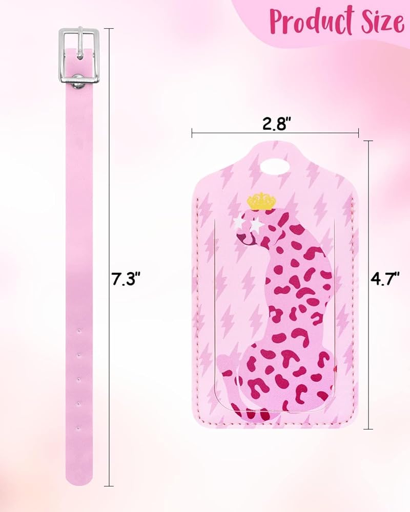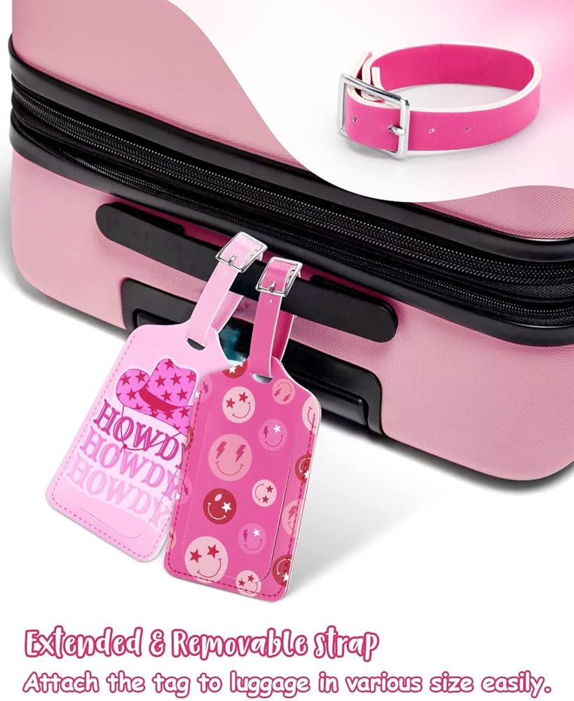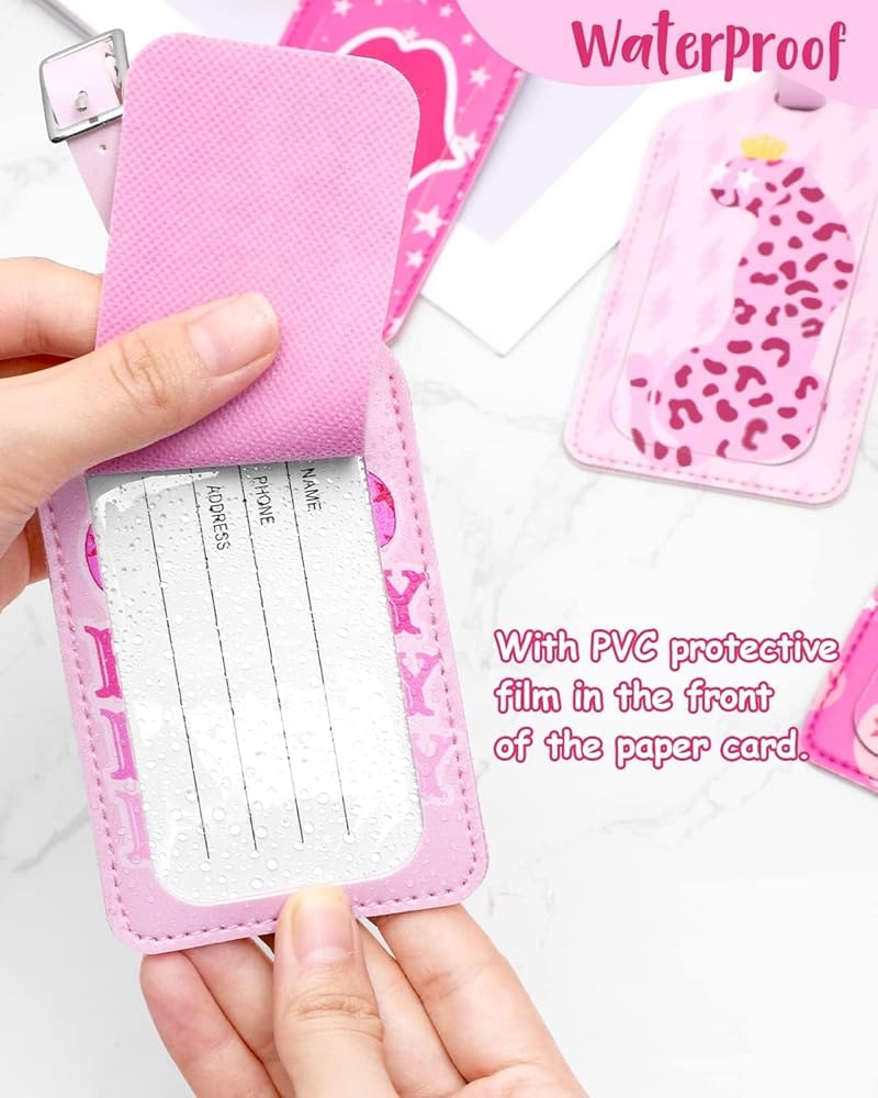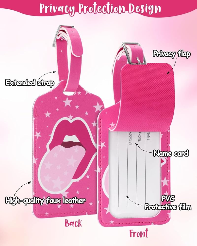 ✈4 Cute Luggage Tags: The package comes with 4 leatherette luggage tags, 4 paper identity cards inside, and 4 adjustable leatherette straps. Our luggage identifiers feature pink preppy patterns like smiling faces, leopards, lips, and cowgirl hats. Eye-catching and fashionable, our unique suitcase tags are bright and easy for fast pickup at baggage claim! Want to identify your luggage at first sight from the airport carousel? Our preppy luggage tags are the best choice for you.