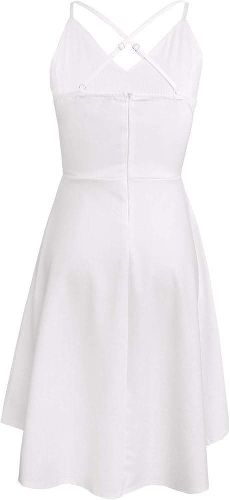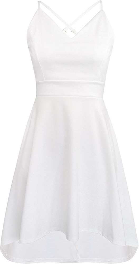 DESIGN: Sleeveless, Sexy Backless, Adjustable Crossover Spaghetti Strap, Plunging V Neckline, Invisible Zip Up, Empire Waist, Unique HIGH LOW Hem, Knee length, Big Flower Print Sexy Swing Party Dress with Pockets.