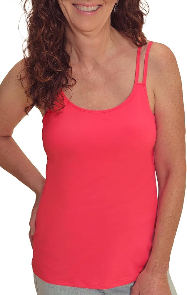 Amoena most popular camisole top, the valetta, was the first to feature an integrated shelf bra with modal pockets and remains at the heart of the leisure collection. Pockets hold a breast form or symmetry shaper securely in place if needed. This camisole offers a rounded neckline in front and back for great comfort and exclusive rhinestone detail on back adds feminine flair.
