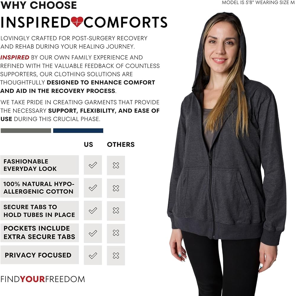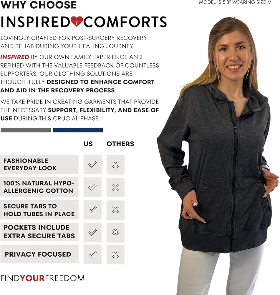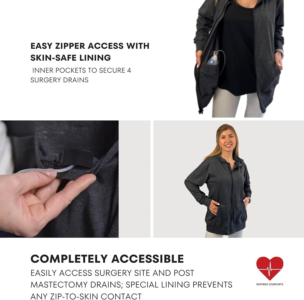 EASE INTO PRIVACY, COMFORT and STYLE – Maintain your privacy and discover comfort as you recuperate post mastectomy/breast surgery; our Mastectomy Recovery Hoodie / Sweatshirt is designed to conceal, secure and provide easy access to up to four JP drains via two inner pockets on each side; this classic elegant design will have you wearing this hoodie long after your recovery as well!