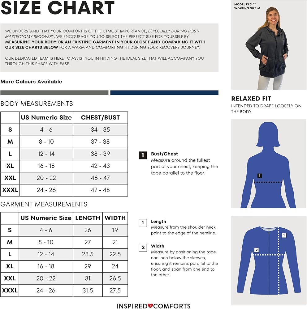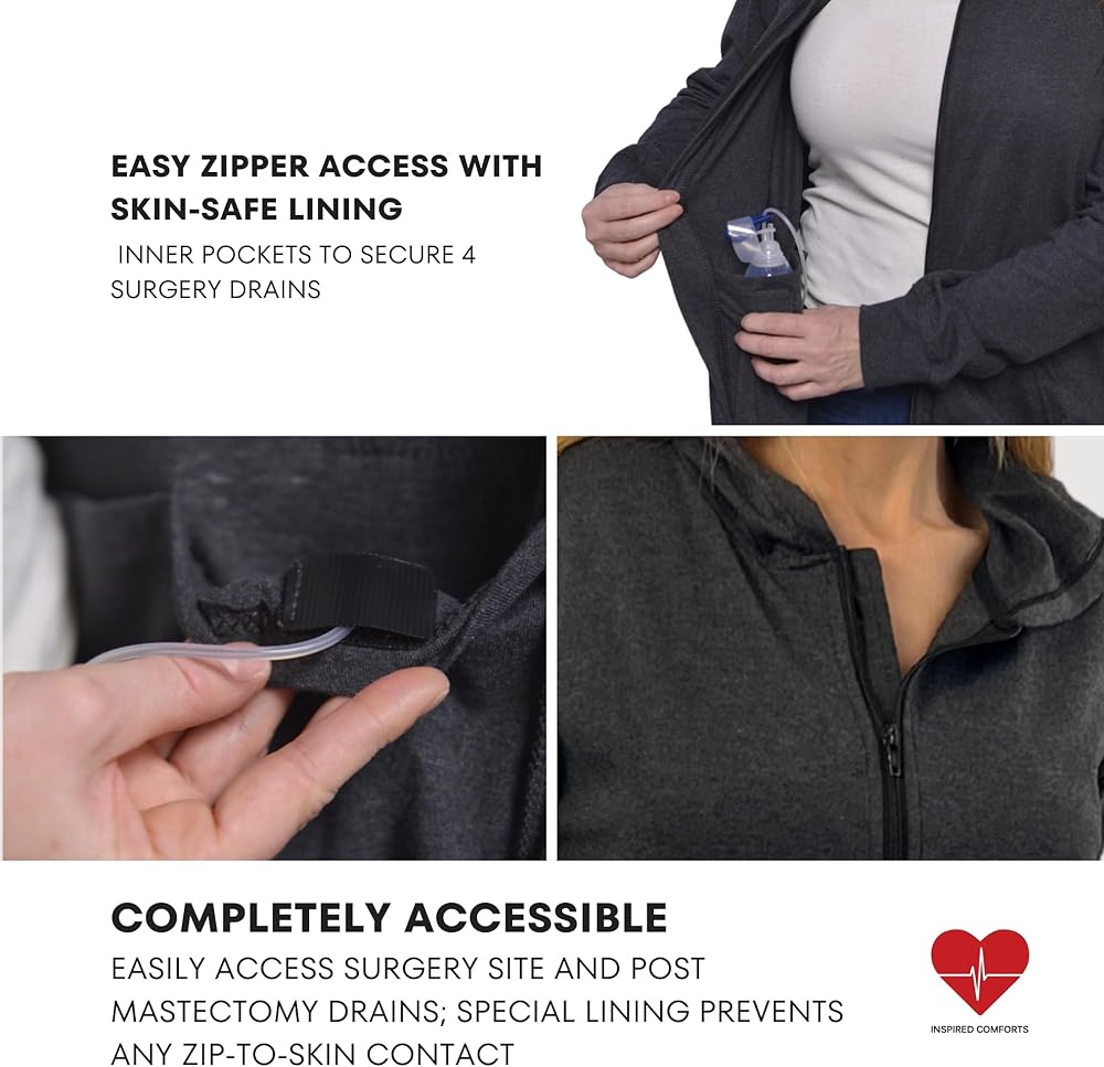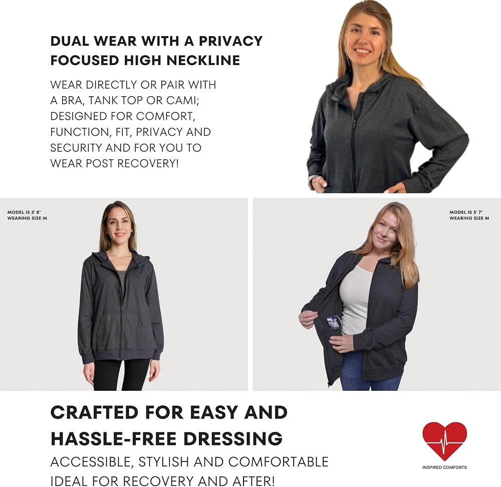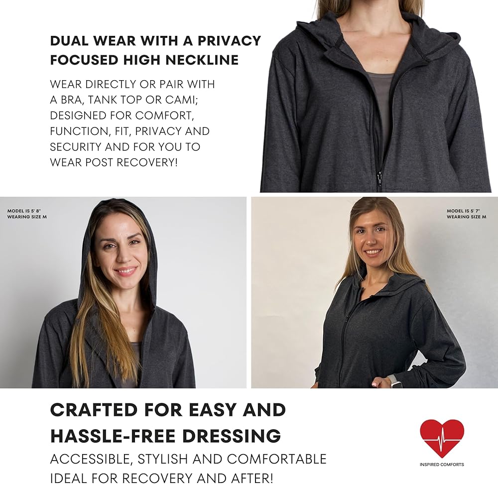 VERSATILE & MULTIFUNCTIONAL, A THOUGHTFUL GIFT - Wear on its own or pair it with a mastectomy bra, tank top or undershirt; zip up with the hood down in those cold moments or zip down when you feel warm; Mix & match colors with your favorite outfit or casually & stylishly cover up without the need to dress up. Thoughtful gift to support single and double mastectomy patients and cancer fighters. Perfect for Post Mastectomy Recovery, Breast Surgery Recovery, Breast Reduction, Breast Augmentation